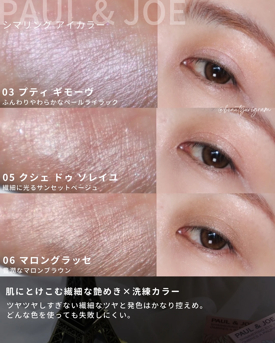 ポール&ジョーの秋コレクションは19世紀パリをコンセプトにした、優美なコスメが勢揃い♥🧁シマリングアイカラー03PetitGuimauve05CirqueduSoleil06MarronsGlacés重ねるほどに深みが増す光と色のグラデーショ...