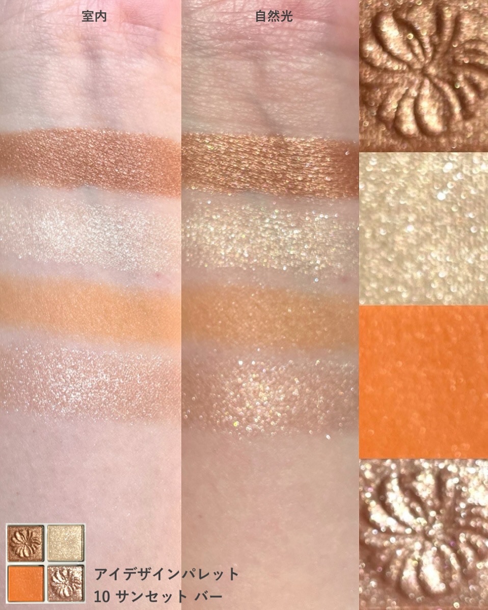 - サンセットが輝くエモーショナルパレット A : サンドブラウン(ゴールド、オレンジ、レッド、ブラウン、ブラック) B : スパークルイエロー(ゴールド、レッド、シルバー) C : サンセットオレンジ D : シャンパンブラウン(シルバー、ゴールド、レッド、ブラウン、ベージュ) 目もとの印象を自由にデザインする、”着まわしパレット“が登場 •ヌーディーなカラーやくすみカラーも大好きだけど、いつものアイメイクからちょっと脱却! アイメイクも楽しみたい!...そんな願望に応えるアイカラーパレットが登場します。 様々な色や素材を貼り付けたムードボードにインスピレーションを受けた「アイデザイン パレット」は、色とりどりの4色をセット。 パレットによってセットされているベースの組み合わせも異なり、それぞれのパレットで様々な色や質感を楽しむことが出来ます。 •1色だけラフにのせたり、2色で色や質感を重ねて奥行きや輝きをプラスしたり。気分がのったら3色、4色とコラージュしてみても! 目もとの印象を何パターンにもデザインする“着まわしパレット”で目もとに気分を映しとり、私らしさを存分に表現して♪ 異なる雰囲気を纏った全8種のカラーバリエーション 全く異なる雰囲気を纏った全8種のカラーバリエーションが、シンボルモチーフであるクリザンテームが施されたエレガントなケースにIN。 1つ1つの色が最も美しく見えることにこだわり、シャイン、マット、グロスの3種のベースを採用し、セットされているベースの組み合わせもパレットにより異なります。 2024年8月1日(木) 発売 ※7月18日(木)より予約受付開始