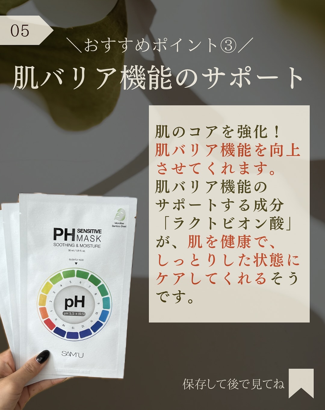 【水分不足な肌に!】 SAM'U PHセンシティブマスクアクアフィット────────────SAM'U PHセンシティブマスクアクアフィットを購入しましたのでレビューします!✦肌のバランスを整えるひたひたシートマスク肌にたっぷりの水分を与え、バランスを整えるシートマスクですヒアルロン酸、アラントイン、パンテノールといった保湿成分や整肌成分が肌を潤しケアします✦ひんやりと潤った肌質に 使用直後は肌の水分量が増えたような潤った肌質になりました 肌が冷え、ひんやりと清涼感も感じました✦テクスチャ水分感の強い、少しとろみのある液ですシートがかなりひたひたしていました✦イマイチなところ使用時間が10〜20分と長めなところシートがずれやすいところ ────────────肌にしっかりと水分を与えてくれるシートマスク肌の水分不足が気になる方にお試ししてほしいアイテムです!ひんやりと清涼感を感じるため夏のスキンケアにも使えそうです【参考】SAM'U公式サイトhttps://www.samu-jp.com/Form/Product/ProductDetail.aspx?shop=0&pid=SC0040&srsltid=AfmBOooX9WQ4_0coFvMpRjj1GAd7erBSgKBj_o8EAUPs_E_tBejMDxkv#SAM'U #PHセンシティブマスクアクアフィット#スキンケア#水分ケア#冬本番に向けた肌仕込み#乾燥肌