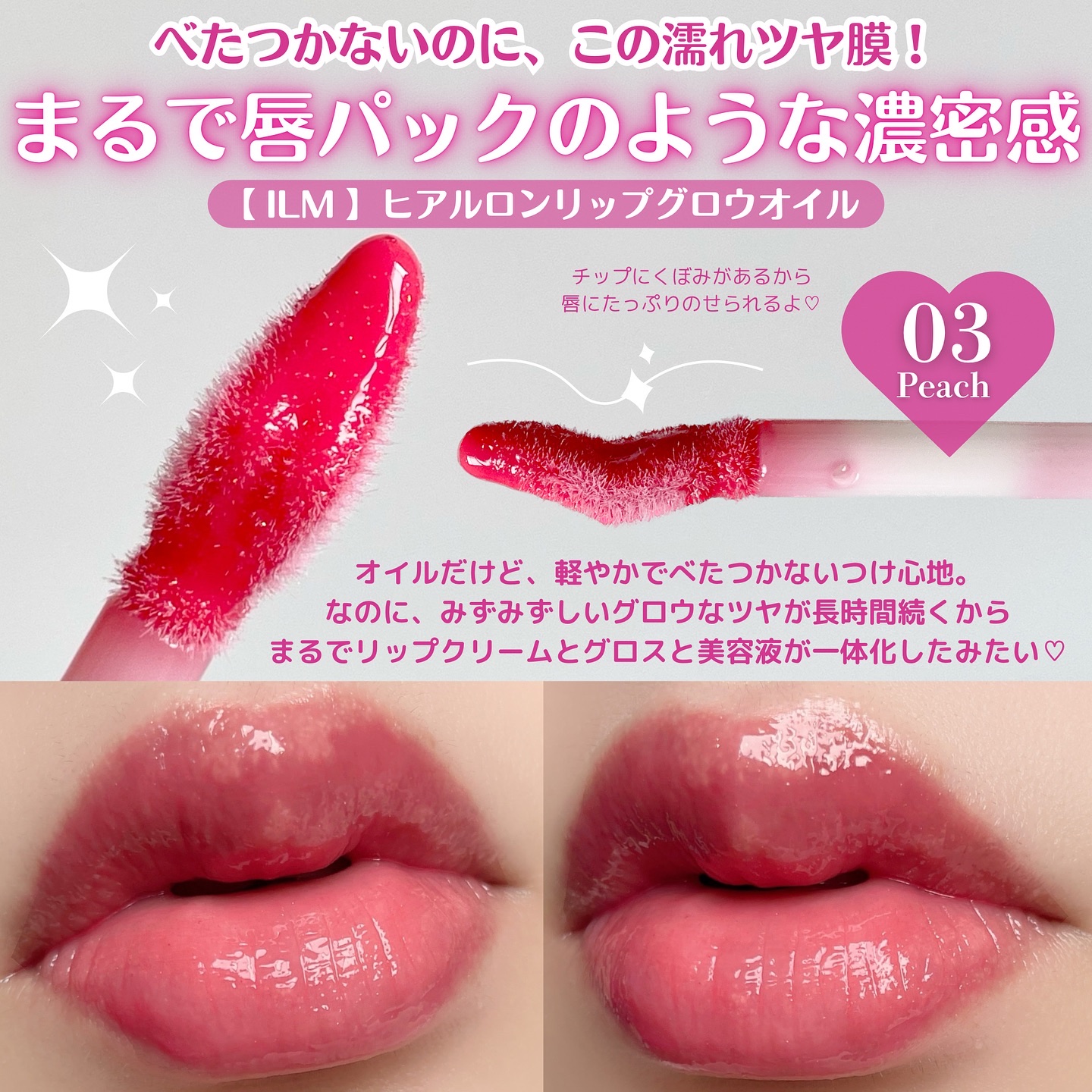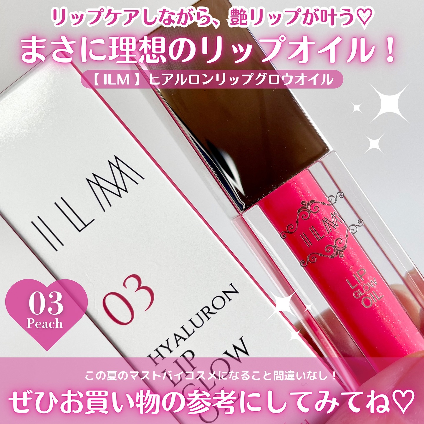 ILMヒアルロンリップグロウオイル03ピーチ唇をやさしく彩りながら、うるおい感のある仕上がりのリップオイル💄肌なじみのよいピーチベージュ系カラーで唇に自然な血色感とツヤを与えてくれる🍑なめらかなオイル状のテクスチャーでベタつきにくく、重さを感じにくい!ひと塗りでツヤとうるおい感を演出し、単品使いはもちろん、リップメイクの仕上げにも取り入れやすい使用感◎保湿成分として、ホホバ種子油、マカデミア種子油、ローズヒップ油、ヒマシ油の4種の植物由来オイルを配合💡(※うるおいを与える成分)乾燥が気になるときにも心地よく使えて、ヒアルロン酸も配合されているからリップケアをしながらメイクも楽しめます💕香りは控えめで、香りが強いコスメが苦手な方にも使いやすいかと思います。ふわっとしたチップで塗りやすく、外出先でも手軽に使えます✨