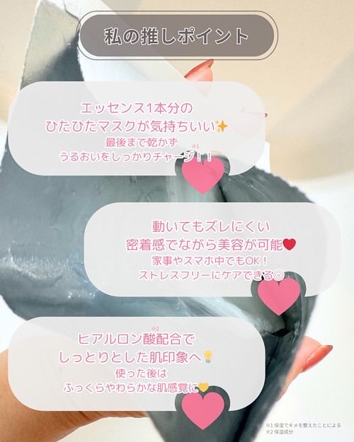 □■これからの季節の味方✨️️□■このマスク、本当に好きでリピートしてるアイテム♡ストックを切らしたくないくらいお気に入りです✨📍エッセンス1本分そのまま!集中うるおいチャージ!※1ヒアルロン酸※2成分を含んだエッセンスがたっぷりひたひた!最...