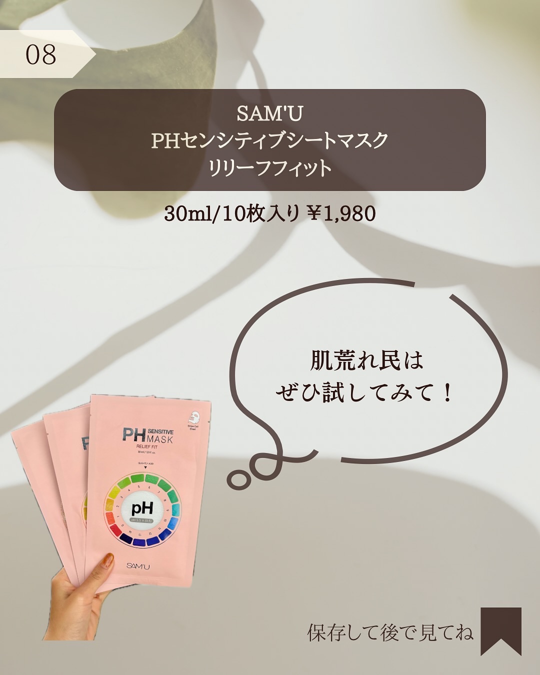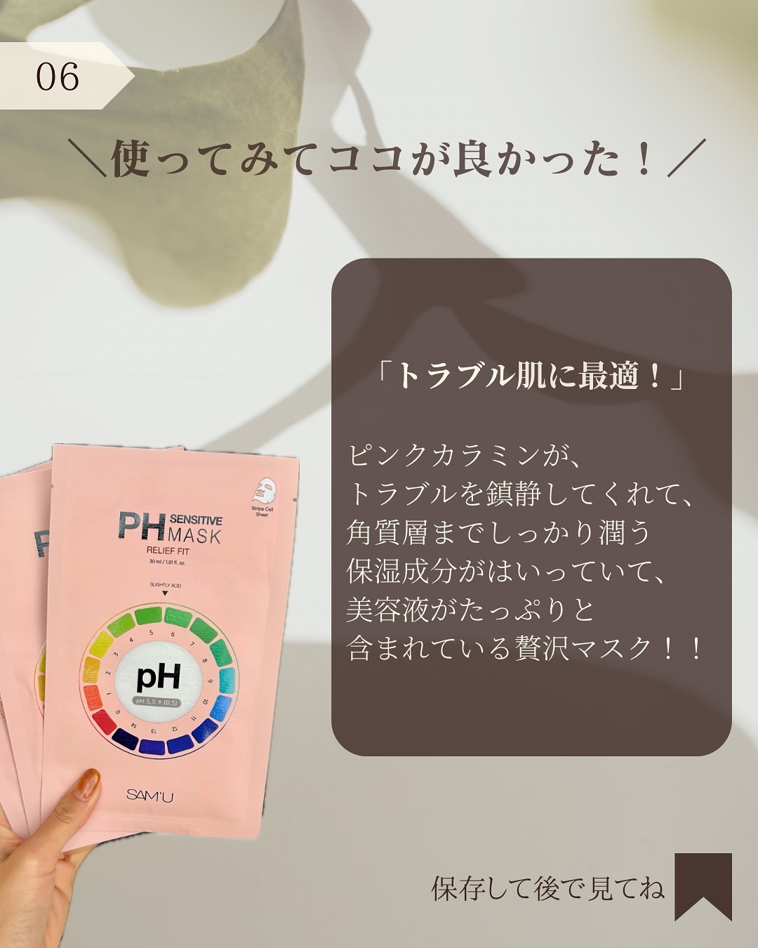 @hana.skincare._👈素肌をキレイにする混合肌スキンケア「肌トラブル民、集まれ!」\”ピンクカラミン”を1枚に閉じ込めたシートマスク!/✓肌バランスが整わない方へ!✓肌荒れやつっぱり感が気になる方へ!🌿商品詳細SAM'UPHセンシティブシートマスクリリーフフィット30ml/10枚入り¥1,980📌おすすめポイント✓ピンクカラミン成分が、敏感肌やトラブル肌を鎮静させてくれる!✓健康的な肌コンディションを維持してくれる!✓余った美容液は体にも使えちゃうのが、嬉しいポイント!@sam_u_jp@samu_jp_review====================================ハナ|素肌をキレイにする混合肌スキンケア🌿\ツヤ肌目指す・美肌ケア💎/◆美容に目覚めて12年目のスキンケアマニア◆テカリ&乾燥 悩みの多い混合肌さん向け◆ドラコスメイン/コスパ◎のスキンケア紹介《成分・効果を徹底解説》◆自分に合ったスキンケア選びができるようになる🌿====================================@hana.skincare._👈いいね・フォロー・保存・コメント・DMなど、とっても励みになります!😳✨#PR#samu#サミュ#商品提供#混合肌用#混合肌対策#スキンケア#スキンケアマニア#スキンケア用品#スキンケア紹介#スキンケア好き#スキンケアオタク#スキンケア難民#スキンケアレポ#スキンケアレビュー#スキンケア商品#プチプラスキンケア#プチプラスキンケア購入品#プチプラスキンケア用品#ドラコス購入品#ドラコススキンケア#素肌ケア#素肌感#素肌美人になりたい#サミュアンバサダー#phセンシティブ#phセンシティブマスク#リリーフフィット#サミュ公式アンバサダー#フェイスマスク