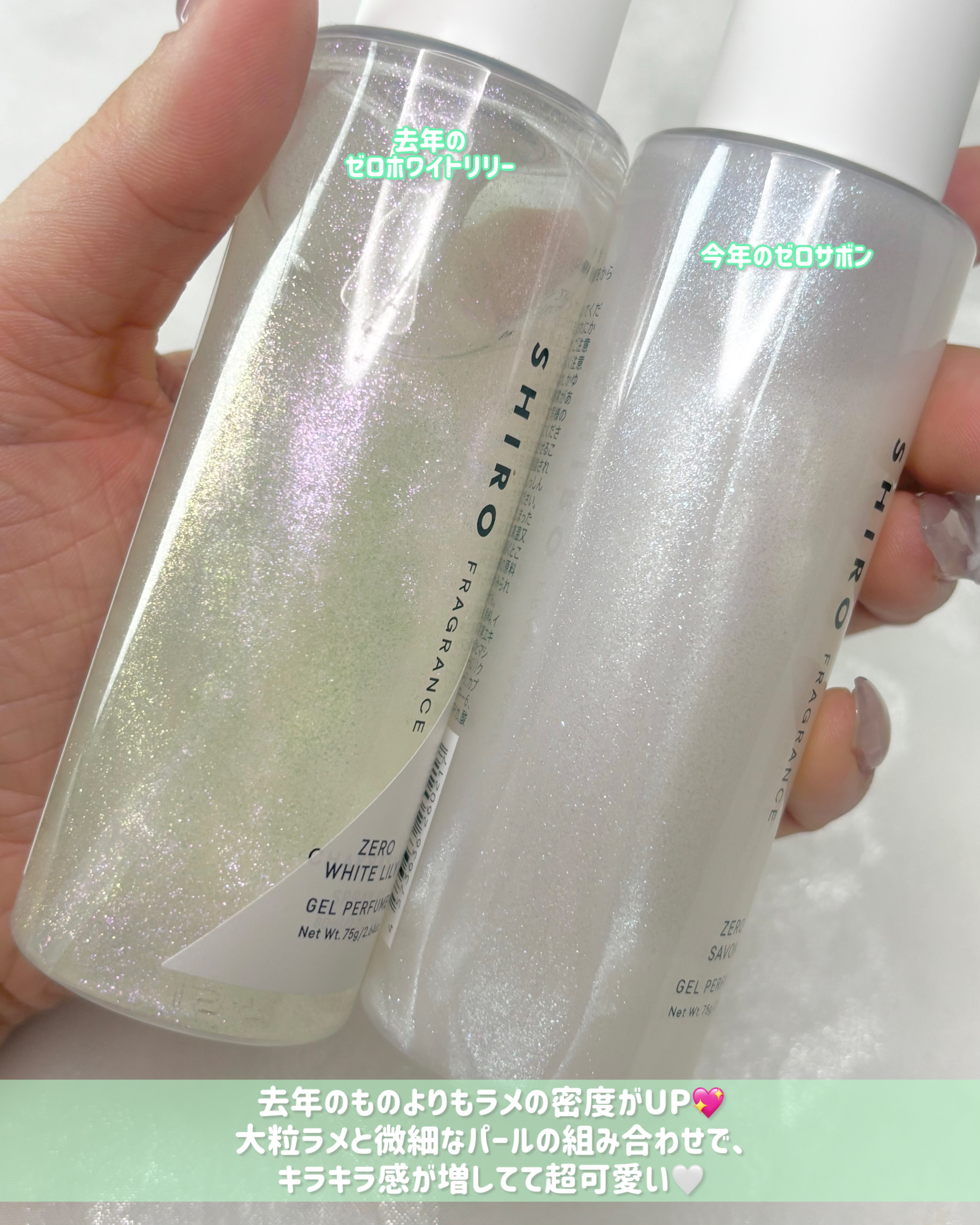 SHIROの新作ラメ入り香水 数量限定昨年発売時に大変好評だったジェル香水。今期も6/12から新たな処方で発売されました!発売初日はオンラインは混み合い繋がらない状態が続く程だったとか…!店員さん曰く、大粒のラメに微細なパールを組み合わせることで昨年よりもシマーな質感を楽しめる仕様になっているとの事です。<香りの持続時間>約1~2時間--------------------------------------------私が店頭で購入したのは迷ってこちらの2種ゼロホワイトティージェルパフュームゴールドとシルバーのラメやパール✨果実とティーを基調としたフルーティーフローラルトップベルガモット、レモン、ペアー、アップルミドルティー、ジャスミン、フリージア、ローズ、スズランラストムスク、アンバー、ウッディ定番のホワイトティーよりまろやかで、あたたかさを感じるフルーティーフローラルの香り。優しいのに深みと奥行きがあって、めちゃくちゃ良い香りのシャンプーなイメージ。夏にも重くない癒される香り………(ため息)果実🍋&花々💐&ティー🫖は最高すぎる。ゼロホワイトリリージェルパフュームピンクとシルバーのラメやパール✨優美な花々のレイヤードが生み出すフレッシュフローラルの香り昨年のホワイトリリーよりピンクラメ濃度が増しているようで外見がとてもピンク🍑(肌に出したピンクラメ全然写ってませんが肉眼ではちゃんとピンクラメおります😢)トップグリーン、レモン、アプリコットミドルリリー、ジャスミン、ヒヤシンス、イランイランラストムスク、アンバー、ウッディ定番のホワイトリリーより花々の奥行きを感じることができる、フレッシュフローラルの香り。実は最初に肌に試し付けした時ラメはめちゃくちゃ綺麗だけど香り甘過ぎるかな…?(ミドルのイランイランが最初に鼻が強く嗅ぎ取ったのかも?)と思い見送りました。しかし30分ぐらい時間置いてから肌を確認したら甘さが落ち着きフレッシュさと柔らかさが増して凄く良い香りになっていて、再度店舗で追加購入したという…!香りの感じ方は個々ありますので是非店頭で試してみてください🌿ジェルタイプのため外出先で吹きつけて香害になる心配もないし、付け過ぎることもほぼない&パフュームより柔らかく香り肌もしつこくないぐらいにキラキラさせられるので良い事尽くし!保湿力も充分でラメ飛びもなし⭕️(服に擦り付けたら流石に付きます)数量限定の為気になる方は是非お早めに☀️サボンも気になってはいるんですよね〜っ香りも良くて青ラメも美しかった…!皆もこの夏キラキラフェアリー🧚になろう!(?)