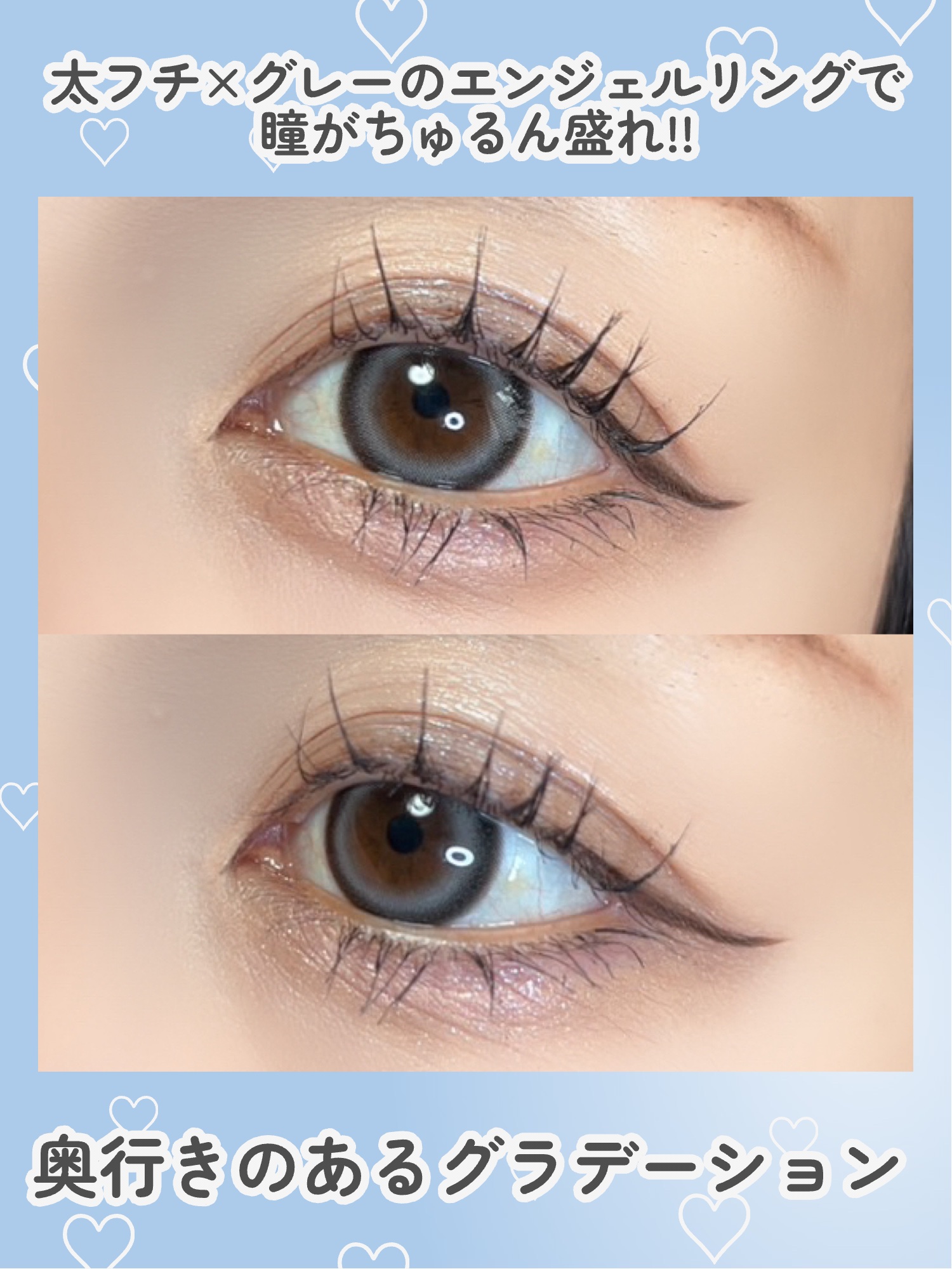〖ANGÉLIQUEルリグレー〗奥行きのあるグラデーショングレーキャットアイっぽいオシャレな感じでどんなメイクにも合いそう👼🏻💕光に当たるとちゅるんと水光カラコンらしい発色になるのが可愛い💕#カラコンレポ#韓国カラコン#カラコンレビュー#ド...