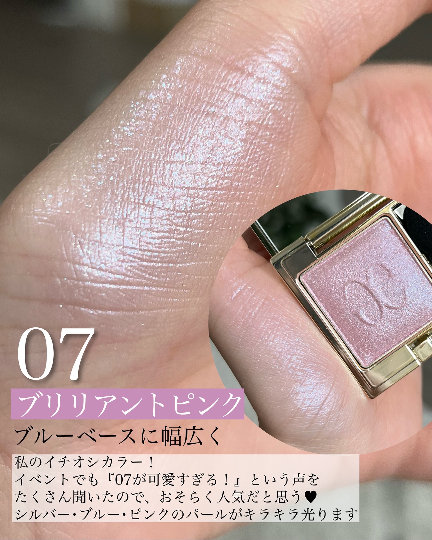 - 04 フェミニンピンク (シルバー・レッド・ ゴールドパール配合) 彩りと輝きがしっとり密着フィット。 瞳に存在感を宿す18色のシングルアイカラー 色と輝きで印象的な奥行きのある目もとへ ・1色ごとの存在感を高める発色・質感・輝きで、惹きつけるほどに美しい目もとに。 ・1色で美しいグラデーションと奥行きのある目もとを演出します。 クリアな発色となめらかな質感をひと塗りで ・透明度の高いベースが上質なツヤと繊細な発色を叶えます。 つけたままの美しさがヨレずにつづく ・透明度の高いパウダーと密着力に優れたオイルを含ませたウェットスムースベースを採用。まぶたに溶けこむようにムラなくフィットし、1色でも重ね付けをしてもにごりのないクリアな発色と、つけたての美しさが続きます。 チップのこだわり ・ミニマムで持ちやすい形状のシングルチップです。スムーズに取ることができ、まぶたの曲線や細かい部分にも使いやすい設計です。