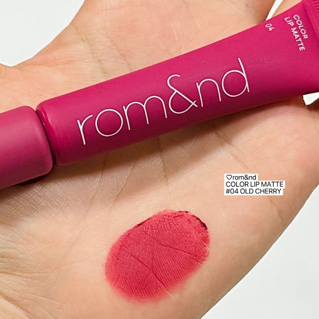 rom&nd⧉カラーリップマット⧉04OLDCHERRY唇の縦じわを埋め、カラーを付け足すパテテクスチャーしわ、角質が浮き立たない、なめらかでふわっとしたパテリップ✼••••✼••••✼04は、青みを足した、クールなビンテージチェリー色は可愛...