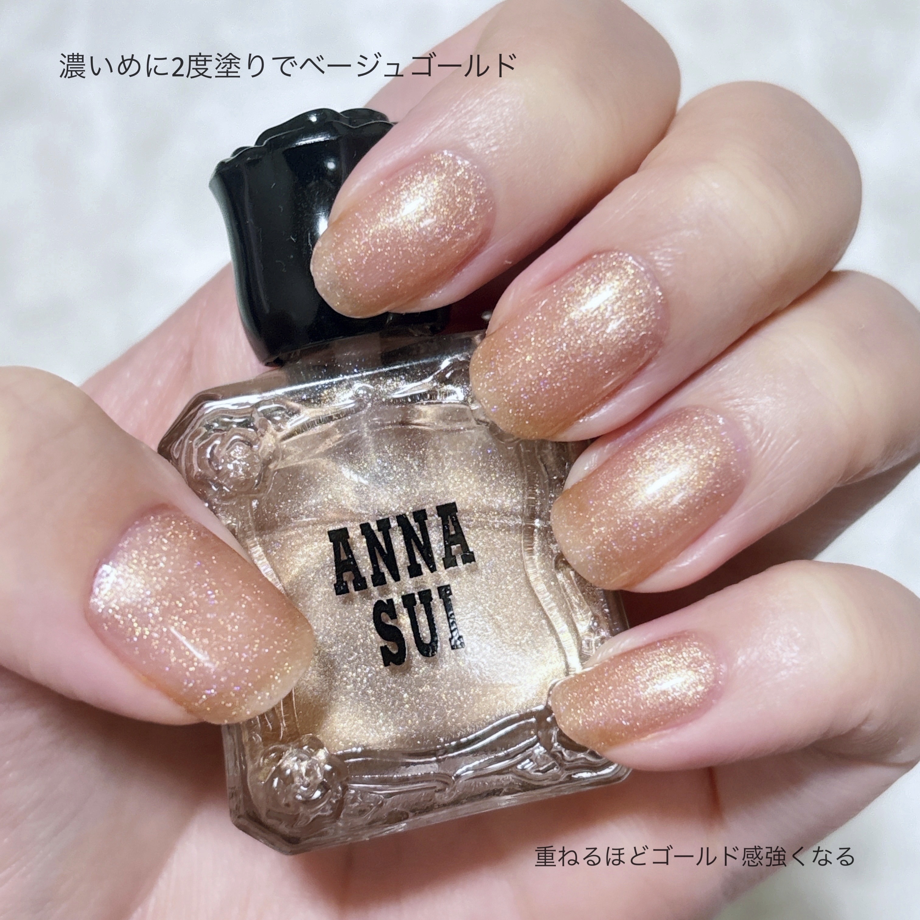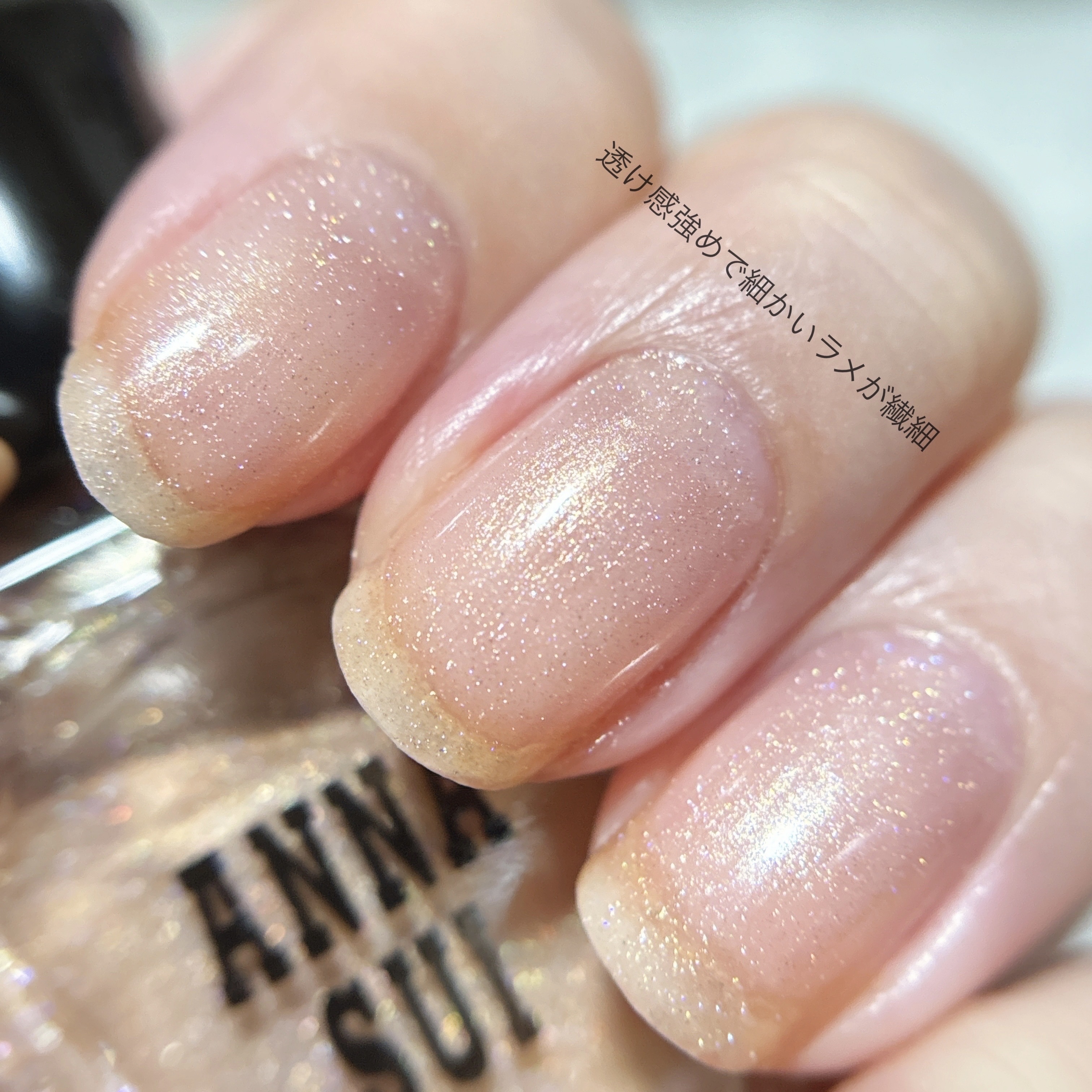 ANNASUIでもナチュラルカラーはある✨706は1度塗りだと本当に透け感強くて細かいラメがチラチラするぐらい。かなり使いやすい。ラメでもいけるならオフィスネイルにも大丈夫そうなぐらい、本当にナチュラル。角度でキラッとした?ぐらいの仕上がりがめちゃくちゃ気に入って、忘れられなくて買いました。今回の限定色の中なら1番シアーでナチュラルかな?と全色実際見て思いました。ていうかこれ、定番でもいいぐらいでは?迷った時になんか塗っておきたいからこれ!とかできるのに!しっかりめに2度塗りすると、ゴールド感強くなる。薄めに2度塗りだとここまで色はっきりしないです。濃さの調整もしやすいのでそこも普段使いしやすいだろうなとポイント高め。インパクトあるカラーばっかり買いましたが、ラストはこの706のシャンパンゴールドっぽさもある細かいラメカラーにて終わり。もっとゴールドラメしっかりのカラーもあったけど、手持ちにあると言い聞かせて5本。これは606と合わせたら可愛いかなと思ってますが、332に重ねても結構良かった。カラー2色、ラメ3色でしばらく色んなアレンジできそうで楽しみ!最初に買った3本まとめは以下↓https://lipscosme.com/posts/7794595ANNASUIって数年に1回、限定がめちゃくちゃ良いの出るけど今回は本当に期待以上!706は買う気一切無かったのに実物見たら本当綺麗なので、店頭かなり減ってるので他の投稿も参考になれば。あと、店頭で買った時に気付いたのが、これだけ色んなものが値上がりしてるのにANNASUIのネイルはリニューアルした時とかわらず2000円でお釣りが来る1,980円。OSAJIより安いことに気付いてちょっとびっくり。ずっと気になってるメイクアップアイテムもあるので、ちゃんと店頭見に行って買おうと思いました。アイライナーが気になる👀✨#セルフネイル#ネイルカラー#ネイルポリッシュ#ポリッシュ#ラメネイル#夏ネイル#新作コスメ#ナチュラルネイル#ラメネイル#花火級の忍ばせラメこれは忍ばせ系のラメ。ちゃんと空気読むラメ。でもANNASUIの空気は読むもんじゃない知らんみたいな一貫した派手めなカラーやラメがやっぱり好きだなー!公開フォルダに手持ちのANNASUIネイルまとめてるのでそちらもどうぞ。208のラベンダーカラーは2本目が半分ぐらいになってるぐらい大好き💜
