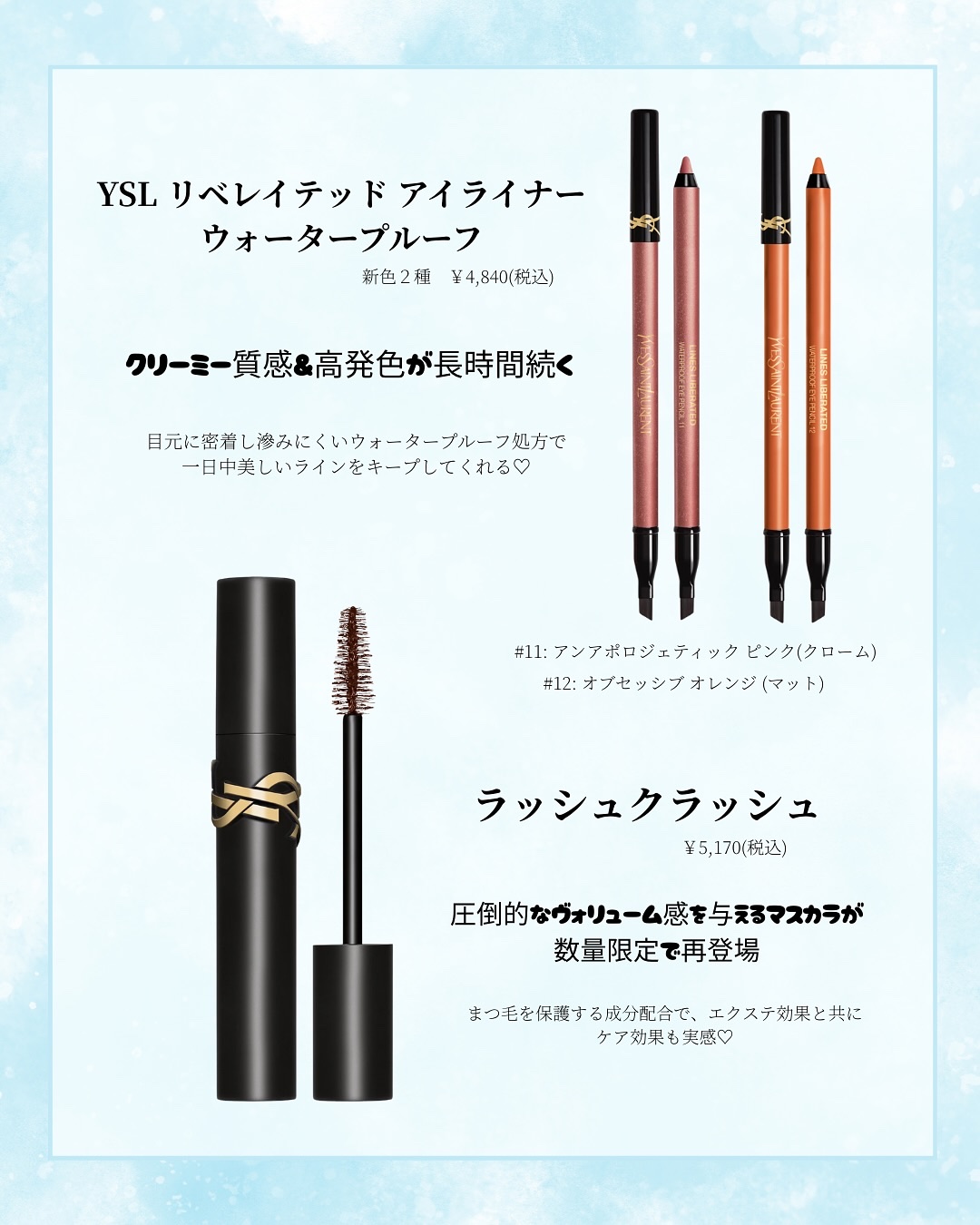 【#YSL】サンローランが愛した「モロッコ」の色彩を探検する秋コレクション🇲🇦🍂8/1発売!✨【#VOCE秋コスメ速報🌈】YSLから秋コスメの情報が届きました!🔥今秋のコレクションは、ムッシュイヴ・サンローランが生涯愛し、インスピレーションの源泉となっていたとされる“モロッコ”へのオマージュ。鮮烈な色彩、豊かな文化、神秘的な自然など様々に溢れるこの国の魅力を、メイクで表現します💄❤️🔥YSLのホットな秋コレクションで、知らなかった新しい魅力に出会えるはず😍!🛍️2025年8月1日(金)全国発売2025年7月23日(水)公式オンラインブティック/表参道フラッグシップブティック先行発売ーーーーーーーーーーーーーーーーーーー🇲🇦YSLクチュールミニクラッチ新4種各¥10890(税込)モロッコでしか目にすることができない幻想的な風景を、ひとつのパレットで多彩に表現。全てのカラーが、既存アイテムとして仲間入りします!👀❤️✨⚫︎730サンライズサファリモロッコの砂漠を、淡いピンク色の光がゆっくりと染め上げていく神秘的な朝の風景をそのまま閉じ込めた、ニュートラルなサンライズピンク。⚫︎820マジェスティックリヤドリヤドの中庭に現れる幻想的な空間、その華やかで神秘的な雰囲気をそのまま閉じ込めた、深みのある官能的なバーガンディー。⚫︎720キャプティベイティングデューンズ光と影を映しながら果てしなく続く砂丘の雄大な風景を表現した、上質でシックなデザートブラウン。⚫︎830アンエクスプロードガーデン木漏れ日が差し込み、色とりどりの花々が咲き誇る未開のモロッコ庭園をイメージした、透明感と深みを兼ね備えたアースグリーン。ーーーーーーーーーーーーーーーーーーー🇲🇦YSLリベレイテッドアイライナーウォータープルーフ新2色各¥4620(税込)クリーミーでとろける描き心地&高発色のロングラスティングアイライナーから、エキゾチックな色彩を楽しむ新色が仲間入り。☝️😍⚫︎11UNAPOLOGETICPINK⚫︎12OBSESSIVEORANGEーーーーーーーーーーーーーーーーーーー🇲🇦YSLラッシュクラッシュ限定1色¥4950(税込)圧倒的なボリューム感でまつ毛をドレスアップするマスカラに、限定色のブラウンが発売!🤎締めすぎないのに、印象的な眼差しを叶えます。⚫︎02UNINHIBITEDBROWNーーーーーーーーーーーーーーーーーーー🇲🇦YSLザインクスヴィニルクリーム新3色(うち限定1色)各¥6490(税込)リッチな発色と奥行きのある光沢感を纏えるリップに、温かみを添える黄み系カラーやキュートなベリーピンクが登場💄⚫︎442CAPPUCCINOKISS【数量限定】⚫︎443POPTHENUDE⚫︎444DIZZYBERRYーーーーーーーーーーーーーーーーーーー🇲🇦YSLザインクスブラークリーム限定2色各¥6490(税込)ふんわりソフトマットな仕上がりを叶えるクリームリップには、鮮烈な印象を残す2色のカラーが限定でお目見え。☺️🔥⚫︎220STRAWBERRYTHRILL【数量限定】⚫︎237SPICEOBSESSION【数量限定】(インスタ担当M)ーーーーーーーーーーーーーーーーーーーーVOCEの公式Instagramでは新作コスメ情報やメイクテク、撮影舞台裏を毎日お届け!⠀👉プロフィール欄のアイコンから、ぜひフォロー&チェックして!#voce#vocemagazine#新作コスメ#美容好きさんと繋がりたい#コスメ好きな人と繋がりたい#yslbeauty#イヴサンローラン#秋コスメ#クチュールミニクラッチ#リベレイテッドアイライナーウォータープルーフ#ラッシュクラッシュ#メイクミーブラッシュリキッド#ザインクスヴィニルクリーム#ザインクスブラークリーム#限定コスメ