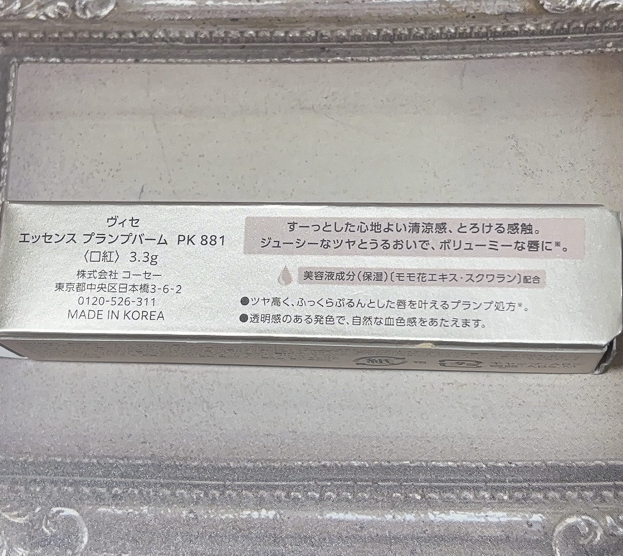 【Visée エッセンスプランプバーム】 PK881ミュートピーチ/¥1,6501本でリップクリーム、口紅、グロスの効果があるとされていて発売前から気になっていましたが、プランパー効果のあるものなので唇が荒れないか心配で購入を見送っていました。しかし、口コミやYouTubeの動画を見たりして、荒れたという方を見なかったので購入してみました。色はミュートピーチを狙っていて、店頭でテスターを試して程良い艶感と、透け感のある色味が気に入りました😊香り付きのものは苦手なのでどうかなと思いましたが、フルーツミントの香りなら使えそうだと思いました。出来れば香料不使用だと尚良かったんですが…。唇に塗ると保湿感と程良い艶も感じられて、何より主張しすぎないピンク色が可愛いです🩷とろけるような塗り心地で、ベタつかないところも好きです😊スースー感もありますが、強すぎないので私は大丈夫でした。YouTubeで美容Botことのさんが『艶タイプなのでティッシュオフしないで過ごした方が1番綺麗に色が持つと感じた』と仰っていたのでティッシュオフしないで過ごしています☺️ティント効果はないので飲食をしたら薄くなりましたが、私は色持ちよりも保湿感があることと透け感のある色味であることの方が重要なのであまり気になりません。(私は唇の血色が良いからなのか、濃い色のリップが似合わないので💦)今のところですが、唇は荒れなかったので安心しました✨️#Visée #エッセンスプランプバーム #PK881 ミュートピーチ