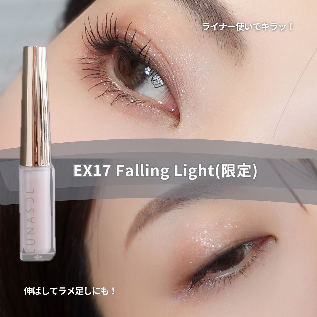 LUNASOL先行販売購入品🛍️LUNASOLフラッシュクリエイターEX17 FallingLight元々、EX16 LightFountainを持っていて白だと浮いてしまうメイクもするから色違いで購入🫶大人が使えるラメ、すごく繊細でかわいい🤤#デパコス#限定コスメ#メイク#ラメライナー#ルナソル
