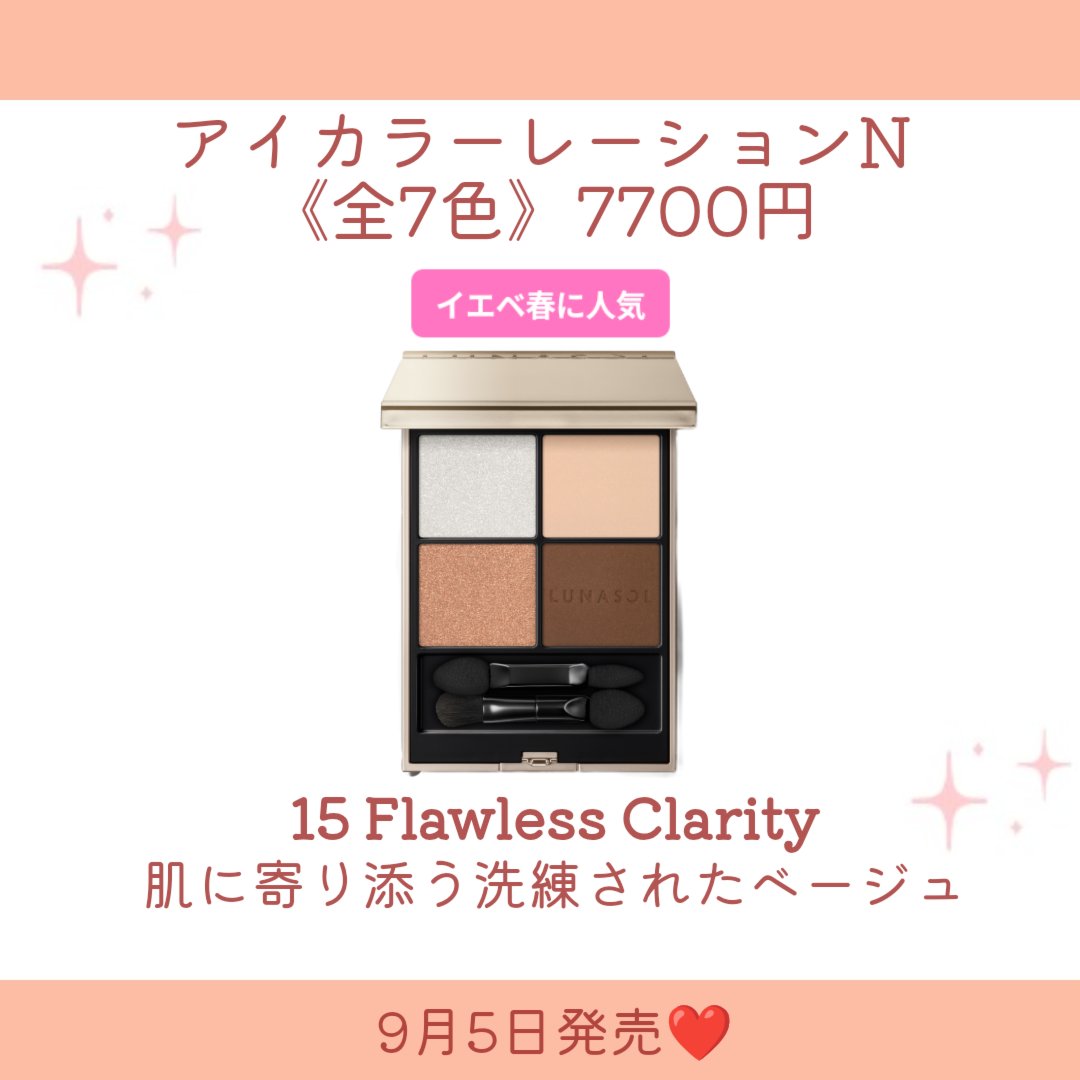 LUNASOL新作情報⟡.·*.··············································⟡.·*.発売日09/052025年秋コスメ♥ルナソルアイカラーレーションN7.700円♡10DeepRoseQuartz♡11SavageRose♡12SmokyQuartz♡13SepiaAmber♡14Mahogany♡15FlawlessClarity♡16MorningGlow♥ルナソルクラリティスキンプライマー4.950円♡01SerenePink明るく透明感を引き立てるセレーンピンク♥ルナソルシークレットシェイド3.960円♡01Neutral青みと赤みのバランスが絶妙な透明感のあるグレイッシュカラーで影になりきるニュートラル♥ルナソルシームレスコレクティングリクイド4.400円♡01VanillaBeige♡02NaturalBeige♡03OrangeBeige♡04CalmYellow♡05ClearLavender♥数量限定ルナソルアイカラーレーションN15キット8,250円セット内容・アイカラーレーションN15FlawlessClarity・フェザリーディファイニングマスカラ01BlackSpinel⟡.·*.··············································⟡.·*.画像はLIPS様よりお借りしましたまた新作情報を投稿させて頂きます#新作コスメ#ルナソル#LUNASOL#アイシャドウ#アイシャドウパレット#プライマー#コンシーラー#シェーディング#数量限定#限定キット#デパコス#ギフト#プレゼント#新色#コスメ紹介#コスメ情報#おすすめ新作#新作