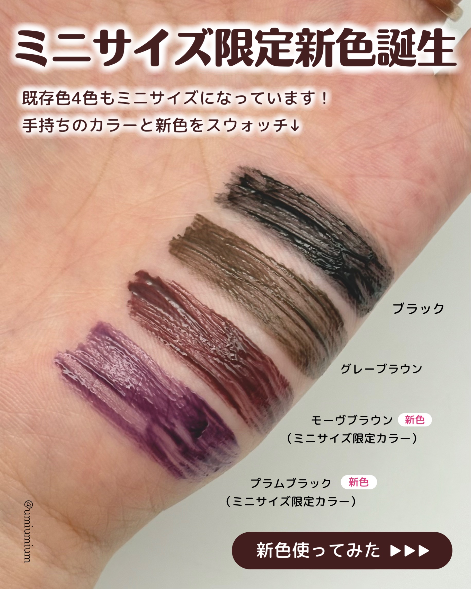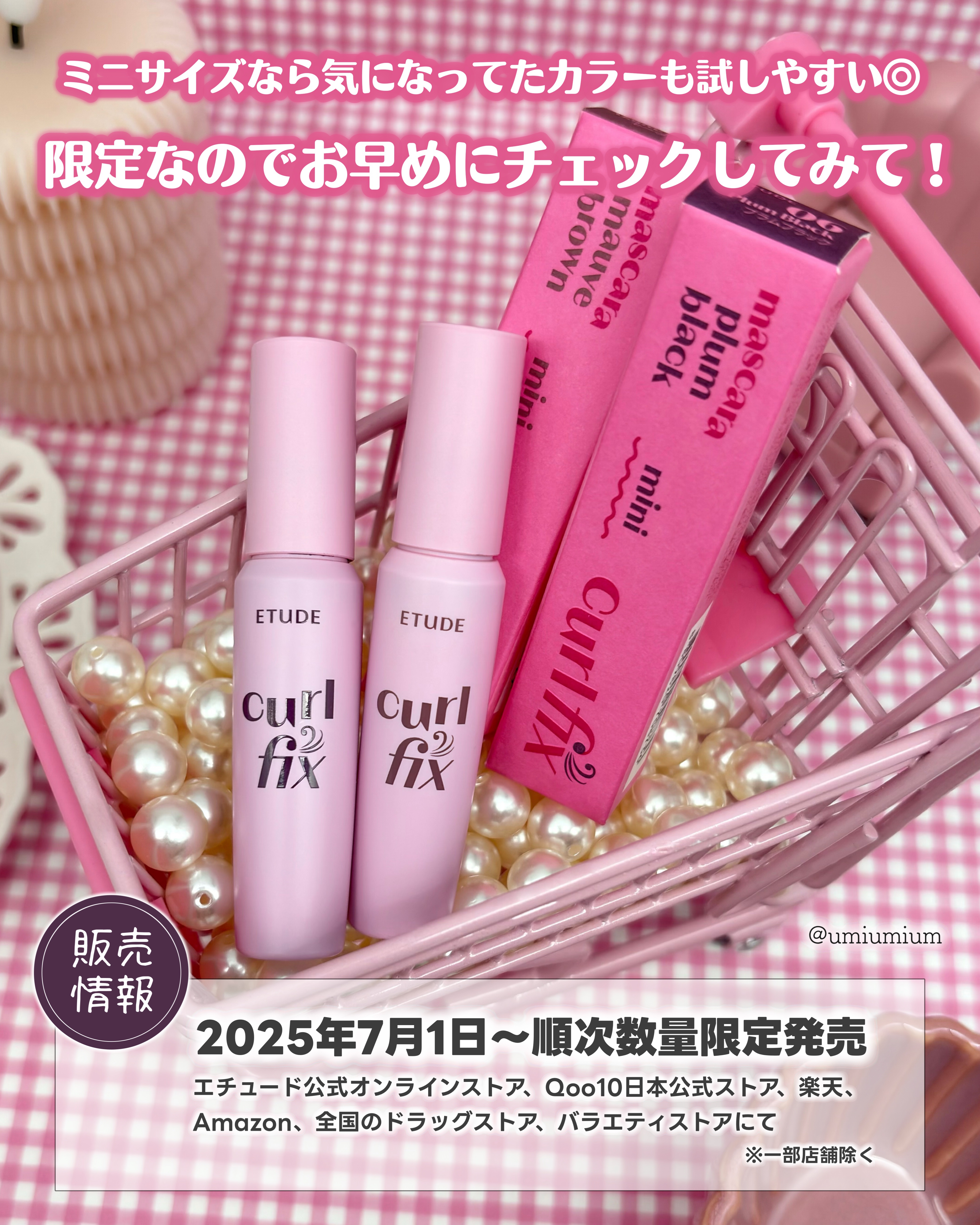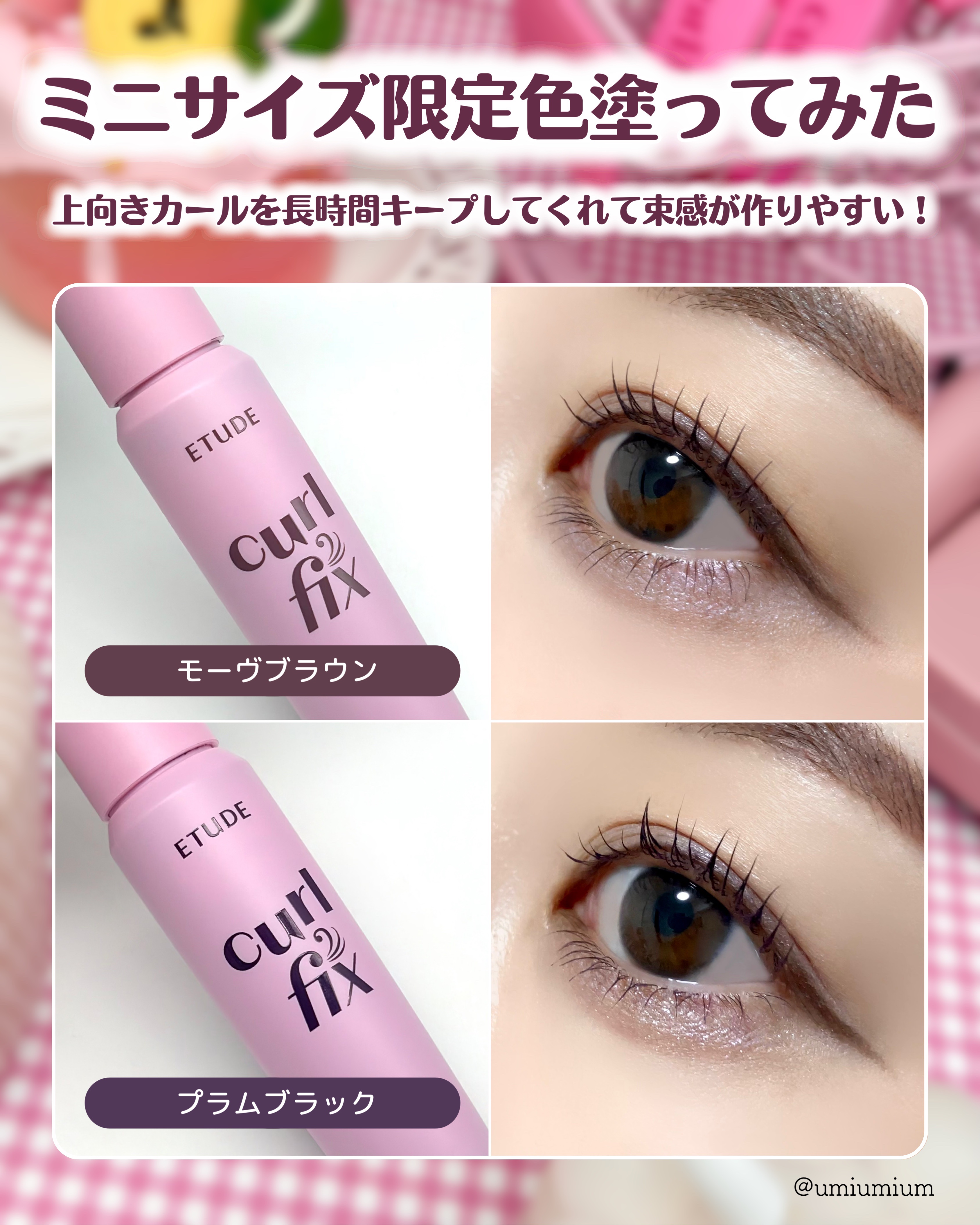 ミニ限定カラー出た!ETUDEのバズり束感マスカラに新色✨┈┈┈┈┈┈┈┈┈┈┈┈┈┈┈┈ETUDEカールフィックスマスカラ(ミニ)モーヴブラウン,プラムブラック(ミニサイズ限定カラー)各¥990(税込)┈┈┈┈┈┈┈┈┈┈┈┈┈┈┈┈こんにちは!うみかです!いつも♡📎フォローありがとうございます🫶🏻本日はETUDE大人気束感マスカラの限定ミニサイズをゲットしたのでご紹介。私はQoo10公式ショップでゲットしました!✍🏻ポイントはこちら┈┈┈┈┈┈①既存サイズをそのまま小さくした可愛いミニサイズ!ブラシは既存サイズと同じサイズで塗りやすさは変わらず◎②くるんと上向きカールを長時間キープしてくれる束感が作りやすいマスカラ。③涙や汗、皮脂に強いウォータープルーフ処方。④ミニサイズ限定新色が2色誕生!既存色4色もミニサイズに!モーヴブラウン(ミニ限定カラー):赤み寄りのブラウンカラー。ふんわり上品で大人っぽい目元に。プラムブラック(ミニ限定カラー):発色の良いパープルカラー。洒落感引き立つ垢ぬけた目元に。🗒️使ってみた感想┈┈┈┈┈┈┈私はミニ限定の2色を購入。塗ってみるとほんのり色味の違いを感じる!可愛い!アイシャドウに合わせて使い分けたいな〜そのままのデザインで小さくなったパケがとっても可愛い…限定と言わず定番化希望です🙏🏻既存カラーもミニサイズになっているのでお試ししやすいのではないかなと✨限定なのでお早めにチェックしてみてくださいね!┈┈┈┈┈┈┈┈┈┈┈┈┈┈┈┈🛒販売情報2025年7月1日~順次数量限定発売エチュード公式オンラインストア、Qoo10日本公式ストア、楽天、Amazon、全国のドラッグストア、バラエティストア(一部店舗除く)にて┈┈┈┈┈┈┈┈┈┈┈┈┈┈┈┈気になっている方のご参考に少しでもなりますと幸いです!その他Instagram投稿はこちらから!@umiumium7777ここまでお読みいただきありがとうございました☺️#ETUDE#エチュード#カールフィックスマスカラ#カールフィックスマスカラミニ#束感マスカラ#エチュードマスカラ#ミニコスメ#バズコスメ#バズりコスメ#新作コスメ#新作#新作コスメ2025#韓国コスメ#束感まつ毛#マスカラ#Qoo10#プチプラ#カールキープ#アイメイク#夜までまつ毛キープ術