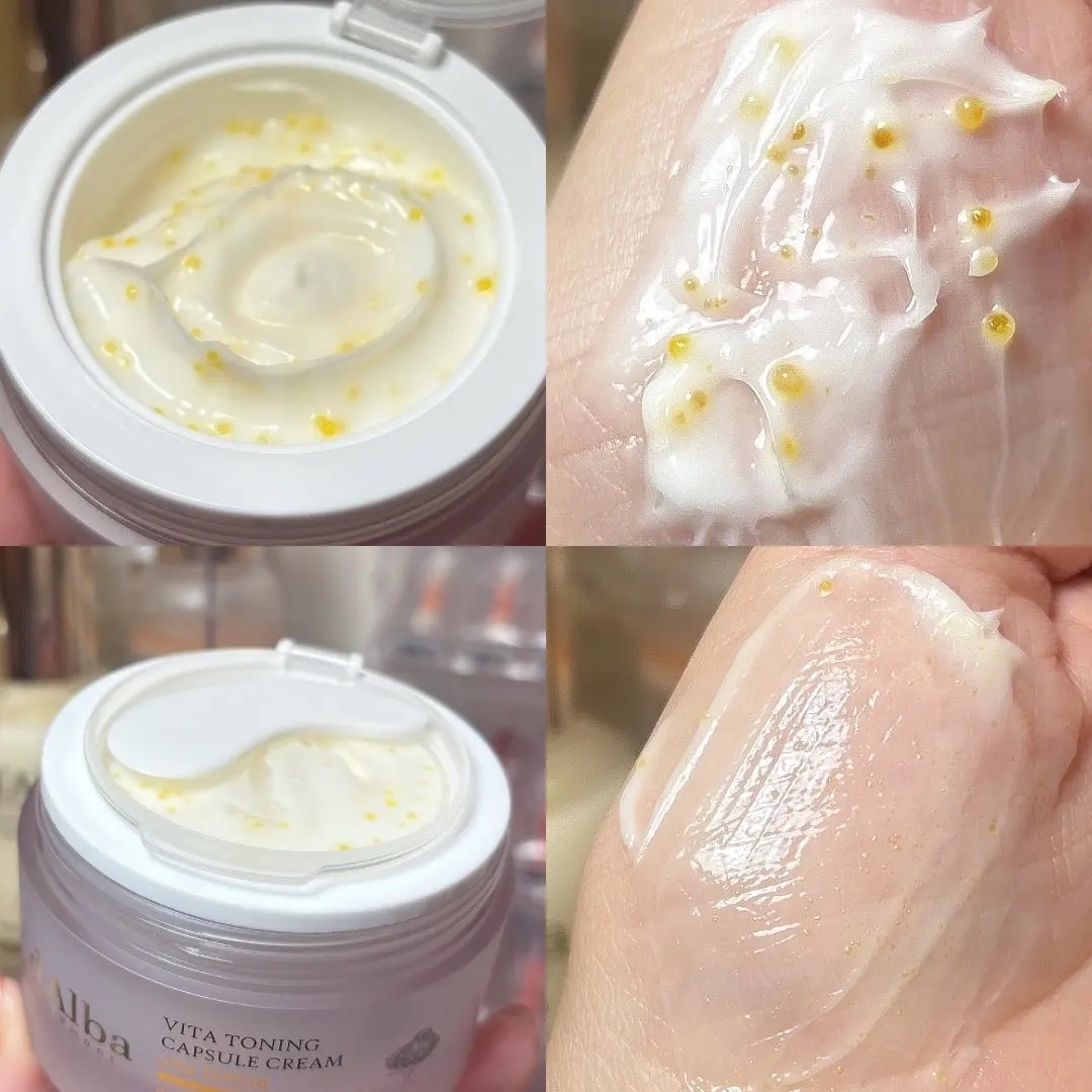 ダルバ@dAlba_japan☑︎ビタトーニングカプセルクリーム白いクリームにビタミンカプセルが混ざるダブルテクスチャー。なじませるたびにカプセルが溶けて、ツヤ感のある仕上がりに✨重たさはなく、スキンケアの最後に取り入れてもベタつきにくい使用...