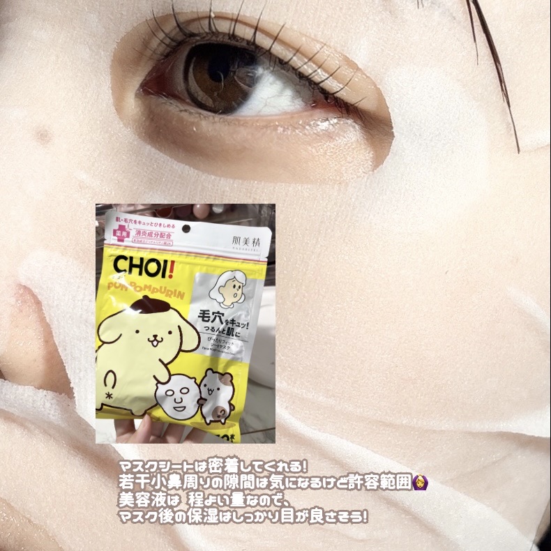 肌美精CHOI薬用マスク肌・毛穴ケアポムポムプリン限定デザインです✨️CHOI!は前回買って使ってみて、リピ決定してたシートマスクでした😍やや柔らかめで厚さは普通、ひたひた度もちょうど良くて、朝使うとすぐスキンケアできる、ベタベタじゃない😉剥...