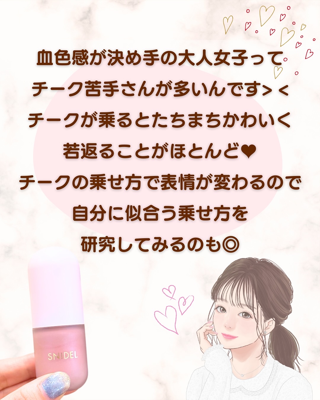 SNIDELを顔に宿す女は100%可愛い🩷あゆみみです🩷パーソナルカラーやコスメの耳より👂🏻な情報を16タイプ・パーソナルカラーアナリスト®のプロの視点からご紹介していきます!...本日は【オススメ品紹介SNIDELフラッフィーブラッシュ】についてお話ししていきます🌸✼••┈┈••✼••┈┈••✼••┈┈••✼••┈┈••✼《#SNIDEL#フラッフィーブラッシュ》全4種/各¥3,300(税込)✼••┈┈••✼••┈┈••✼••┈┈••✼••┈┈••✼大人女子はチーク苦手さんが多くてチークをしないという方がサロンのお客さまでも多い印象……ですが、それはもったいない❣️大人女子はチークをすると華やかになりかなり若見えします🥰✼••┈┈••✼••┈┈••✼••┈┈••✼••┈┈••✼そして7つのフリー成分なのが肌弱さんにとっても嬉しいポイント✨️︎︎︎︎☑︎︎︎︎︎紫外線吸収剤フリー☑︎合成香料フリー︎︎︎︎☑︎パラベンフリー︎︎︎︎☑︎動物由来成分フリー︎︎︎︎☑︎鉱物油フリー︎︎︎︎☑︎ナノ粒子フリー︎︎︎︎☑︎アルコールフリー✼••┈┈••✼••┈┈••✼••┈┈••✼••┈┈••✼【01RefinedPink】ちゅるんとふっくら色めくベビーピンク❤︎ブルベ夏🩵・ブルベ冬🩷にオススメ❤︎【02RelaxyCoral】じんわりと幸せがにじみ出るやわらかい発色のロージーコーラル❤︎ブルベ夏🩵・イエべ秋🤎にオススメ❤︎【03OwnIntention】シアーなゴールドパールがつやめくデューイベージュ❤︎イエべ秋🤎にオススメ❤︎【04DaringRose】じゅわっと血色感が宿るチェリーレッド❤︎イエべ秋🤎・ブルベ冬🩷にオススメ❤︎✼••┈┈••✼••┈┈••✼••┈┈••✼••┈┈••✼フォローして他の投稿も見てみてください🩷@ayumimi_color👈🏻✼••┈┈••✼••┈┈••✼••┈┈••✼••┈┈••✼ラピスの16タイプカラーメソッド®に基づくアナリストの個人の見解です...長野駅周辺で16タイプ・パーソナルカラー診断ができます🌈ご予約・詳細はハイライトをご覧ください📱✨️#スナイデル#snidel#チーク#リキッドチーク#オーガニックコスメ#ナチュラルコスメ#コスメ紹介#パーソナルカラー#ブルベ#イエベ#イエベ春#ブルベ夏#イエべ秋#ブルベ冬