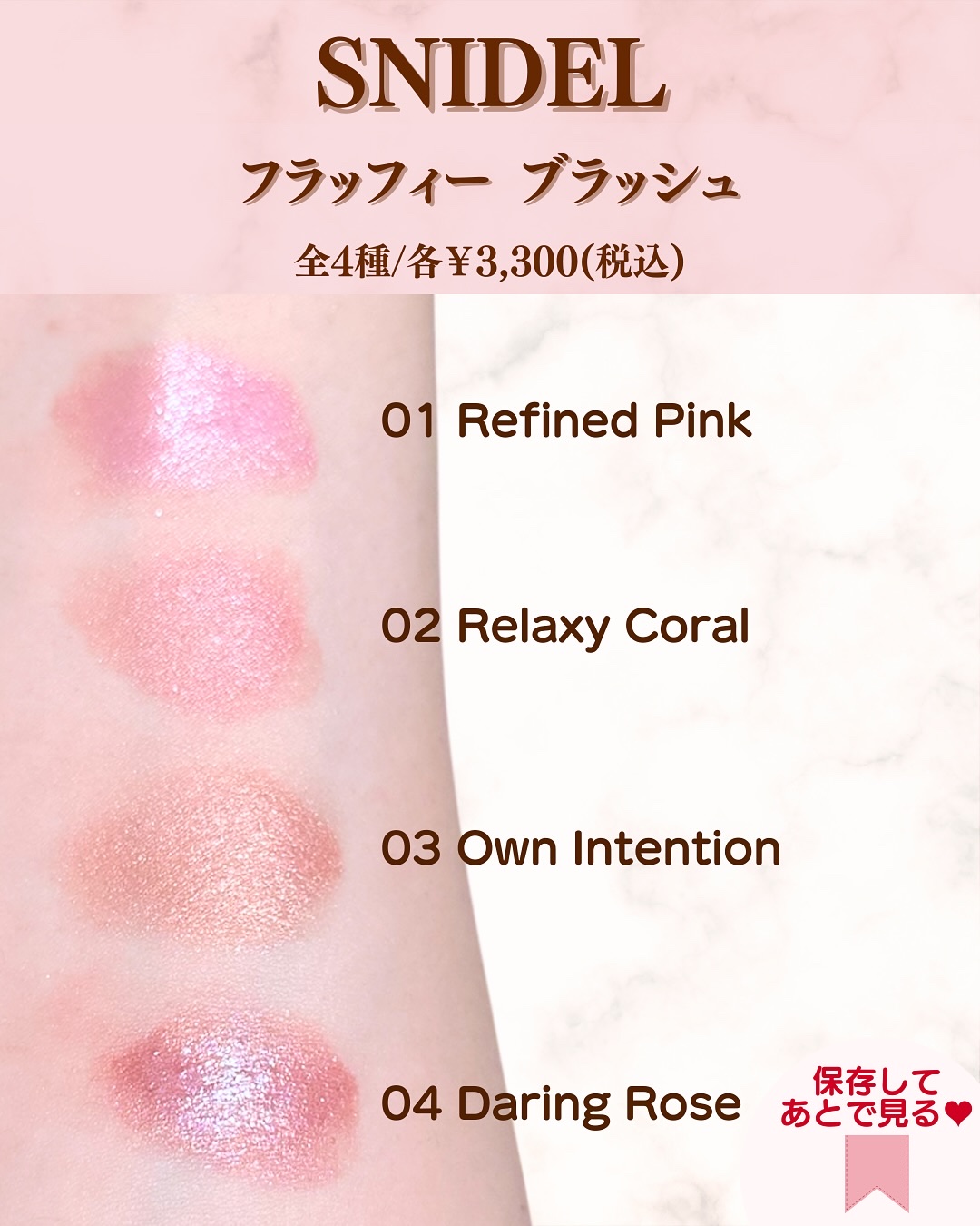 \全4色しっかり比較🧸/【SNIDELBEAUTY】2025.7.11に発売されたふわっと透ける“リクイドチーク”が最高すぎた…⸻スナイデルビューティーの新作「フラッフィーブラッシュ」を全色レビュー🫧ぽんぽんのせると素肌を透かす色づきで、内側からにじむような血色感が簡単につくれる可愛いチーク!・粉感ゼロなのに密着力が高い・指塗りでもムラになりにくい・軽やかでシルキーなテクスチャー・光の効果で毛穴までぼかして美肌見え・ふんわりと透けるヴェールカラー自然光で色味が分かりやすいように撮影しました📷以下、1色ずつ紹介していきます👇SNIDELBEAUTYSNIDELフラッフィーブラッシュ¥3,300⸻🩰01RefinedPinkちゅるんとふっくら色めくベビーピンク。理想の"赤ちゃんほっぺ"を自身の頬に✔︎ブルベさんの王道チーク✔︎デートやきれいめメイクにぴったり⸻🍑02RelaxyCoralじんわり幸せが滲み出すロージーコーラル。キュートな発色で無垢な素肌をもたらす✔︎イエベ春さんにおすすめ✔︎オフィスメイクにも◎⸻🌹03OwnIntensionライブリーにつやめくデューイベージュ。表情に溶け込みヘルシーな色っぽさをオン✔︎イエベにおすすめベージュカラー✔︎おしゃれ顔にしたい日に!⸻🌹04DaringRoseキュンとした血色感が宿るチェリーレッド。チャーミングな高揚感で笑顔が似合う頬に✔︎秋冬メイクにぴったり✔︎小顔効果も狙える引き締めカラー⸻🎨使い方のコツ指でぽんぽんとなじませるだけでOK!濃く発色するので、少量ずつ重ねて調整するのがコツです。⸻💬まとめふんわり軽やかで仕上がりが本当にきれい✨“柔らかいツヤ”が今っぽくておしゃれ。ナチュラル派にも、盛りたい日にも◎ひとつ持っておくと重宝するリキッドチークです🪞どれが気になりましたか…♡色選びの参考になればうれしいです🕊️⸻#スナイデルビューティー#フラッフィーブラッシュ#チーク比較#新作コスメ#イエベ春#ブルベ夏#コスメレビュー#全色スウォッチ