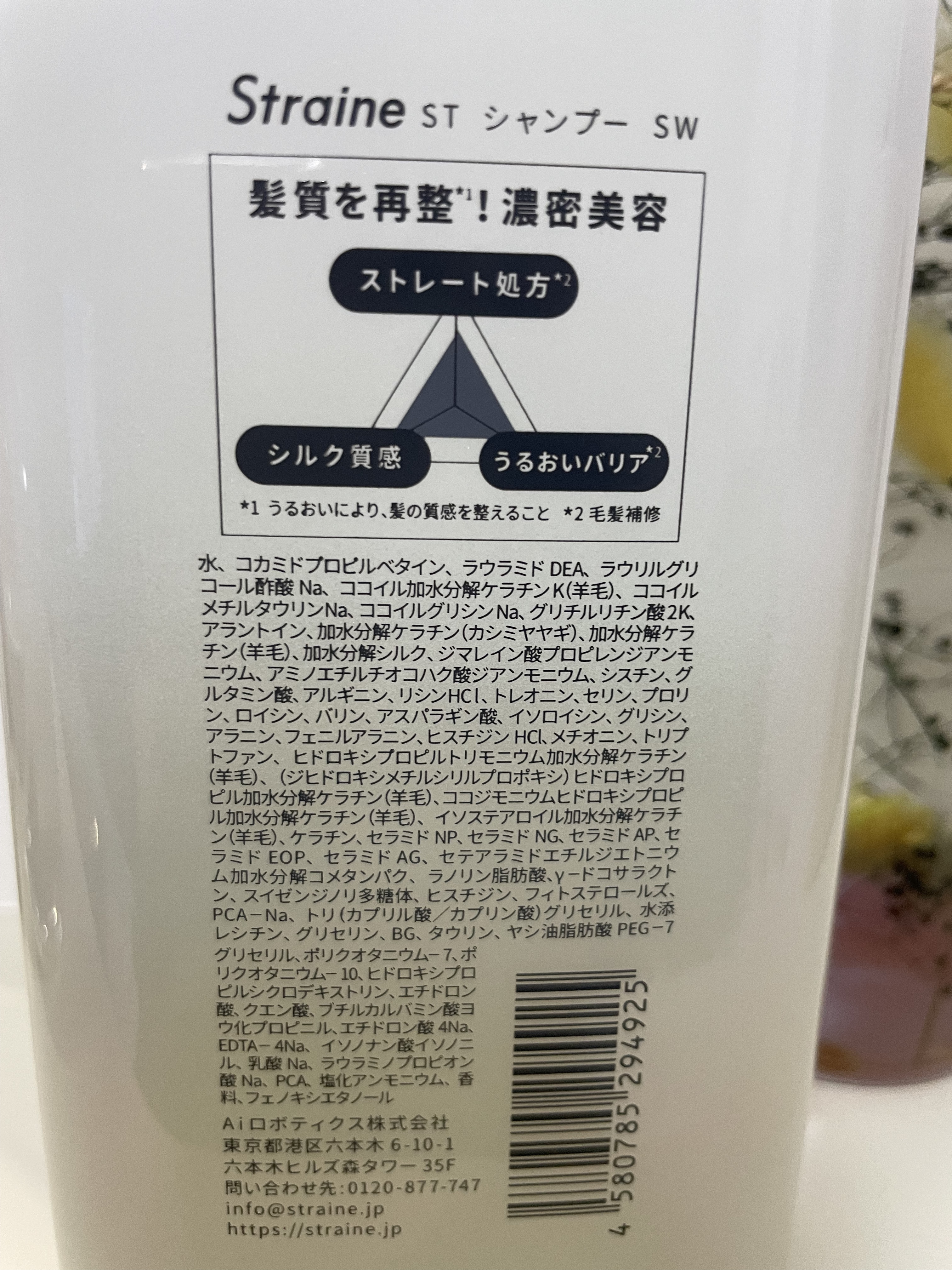 - “straight(真っ直ぐ)”と“line(線)”を組み合わせた造語「Straine」は、まるで一本の美しいラインのようにしなやかで整ったストレートヘアをイメージ。理想のストレート質感を目指し厳選した補修成分と内部構造に着目した独自の補修設計技術で、乾燥によるクセ・うねりケアに悩むすべての人へ、新しい自分との出会いをお届けする新ヘアケアブランドです。  ️髪の内部構造に着目した、独自の「トリプルストレート処方」 縮毛補修発想。髪の内側の構造に着目し、まっすぐまとまる髪を科学的に研究し導きだした3つの処方。 髪の構造を深く理解したアプローチで髪質を再整*1し、潤いを保ちながら、滑らかな指通りへ。 9種の必須アミノ酸*2と7種のケラチン*3を贅沢に配合し、髪内部を補修をしながら、理想の“シルクストレート質感*4 ”を目指します。  ️POINT01|内部補修 -髪内部のうねり原因を補修。まっすぐな髪を目指して。 髪のうねりの原因となる乾燥による内部構造の乱れを、必須アミノ酸*2を含むアミノ酸と密度補強成分「ジマレイン酸」*5で補修。さらに、縮毛補修発想から生まれた成分「トステア®」*6を配合し、ハリ・コシのあるストレート髪を目指します。  ️POINT02|シルク質感 ‐ダメージを立体補修 ダメージによって生まれた髪内部の空洞“ダメージホール”を、保湿成分である7種類の分子量の異なるケラチン*3が髪芯部まで浸透し、立体的に内側まで補修。PPT系高級洗浄成分*7が、髪1本1本を洗い上げ、しなやかで指通りなめらかな“シルクタッチ”の髪へと仕上げます。  ️POINT03|うるおいバリア ―湿気や熱から髪を守る 湿気によるうねりを防ぐために、5種のセラミド*8とサクラン®*9で髪内部の水分をキープ。さらに、熱に反応してバリアを形成する「γ-ドコサラクトン」*10と、キューティクルを保護する「擬似18-MEA」*11が外的ダメージから髪を守り、湿気から髪を保護しながらストレート状態を長時間キープします。  ️凛とした透明感が香り立つホワイトブロッサムの香り サロン帰りのような心地よさを、毎日のバスタイムに。フレッシュなフローラルと果実の爽やかさが調和した、みずみずしく上品な香りです。 *1 うるおいにより、髪の質感を整えること *2 バリン、トレオニン、イソロイシン、ヒスチジン、フェニルアラニン、ロイシン、リシンHCl、メチオニン、トリプトファン(全て保湿) *3 加水分解ケラチン(カシミヤヤギ)、ヒドロキシプロピルトリモニウム加水分解ケラチン(羊毛)、(ジヒドロキシメチルシリルプロポキシ)ヒドロキシプロピル加水分解ケラチン(羊毛)、ココジモニウムヒドロキシプロピル加水分解ケラチン(羊毛)、イソステアロイル加水分解ケラチン(羊毛)、加水分解ケラチン(羊毛)、ケラチン(全て保湿) *4 うるおいによる、なめらかな質感のこと *5 ジマレイン酸プロピレンジアンモニウム(保湿) *6 アミノエチルチオコハク酸ジアンモニウム(保湿) *7 ココイル加水分解ケラチンK(羊毛)(洗浄) *8 セラミドNG、セラミドAP、セラミドAG、セラミドNP、セラミドEOP(全て保湿) *9 スイゼンジノリ多糖体(保湿) *10 (保湿) *11 セテアラミドエチルジエトニウム加水分解コメタンパク、ラノリン脂肪酸(保湿)