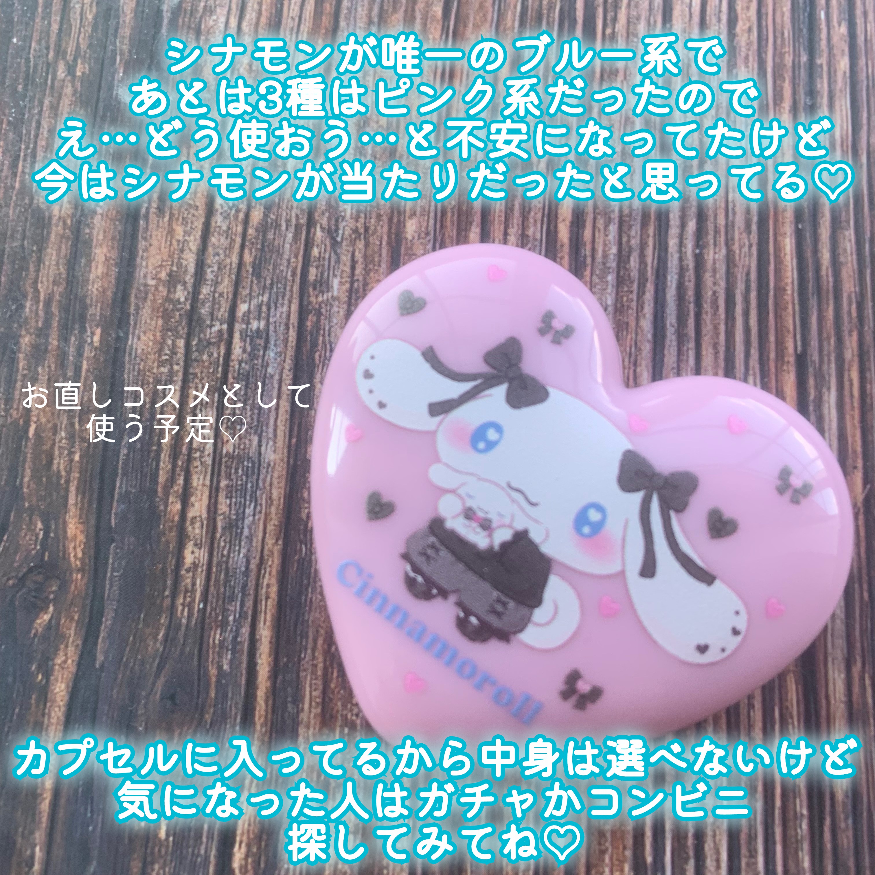 ポンデクルールマルチカラーパウダーうるうるハートデザインシナモロールガシャポンのコスメ!!500えん。五百円玉より少し大きいくらいのサイズ。使い切れそうなサイズで良いです。少し開けにくいです。しっかりカチッと閉まります。ちっちゃいシナモンを持...