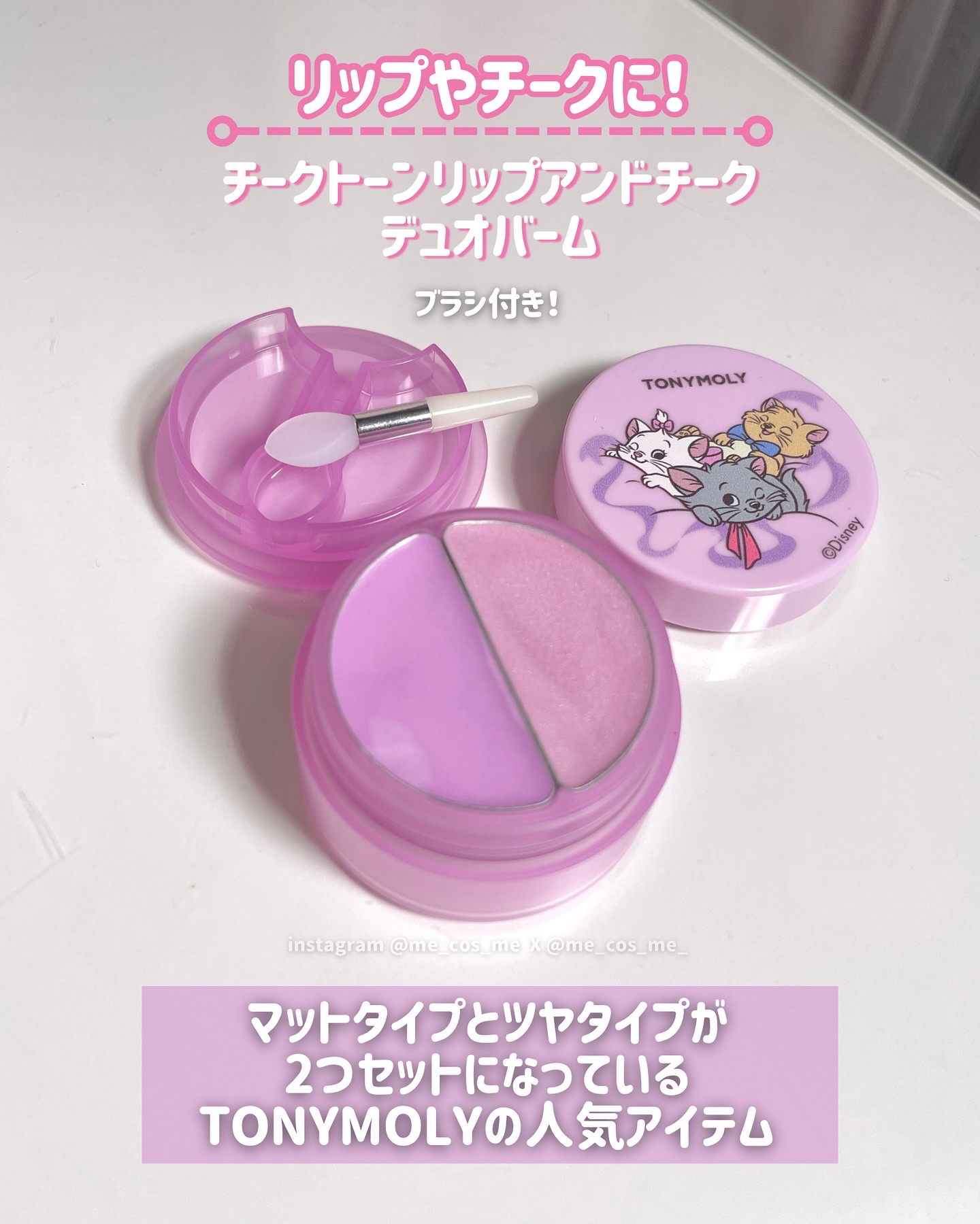可愛すぎるコラボコスメ🐈🎀\TONYMOLY×マリーエディション/Qoo10で購入出来て、おまけもついてくるよ!#マリーリップアンドチーク14キャッツラベンダービーム👉🏻購入でマリーちゃんのヘアピン、シリコンキーリングが貰える!!#マリーショッキングリップN15グレープショッキング👉🏻購入でマリーちゃんのシュシュとリップリムーバーが貰える‼︎どちらも1,512円(税込、Qoo10メガ割価格)プレゼントは数量限定なくなり次第終了韓国コスメマニアInstagramフォローしてね👉🏻@me_cos_me新大久保在住のトレンド情報サブ👉🏻@me_shin_okubo✼••┈┈••✼••┈┈••✼••┈┈••✼••┈┈••✼@tonymoly.jp_official@tonymoly投稿義務なしのギフティング#gifted#TONYMOLY#トニーモリー#韓国コスメ#リップアンドチーク#ブルベ冬コスメ#ティントリップ#Qoo10#メガ割#qoo10限定#disney#ディズニーコスメ#토니모리