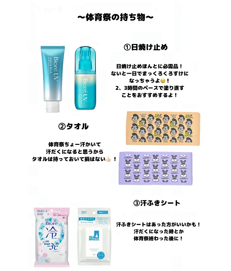 #体育祭頑張りマース💪(´・_・`💪)タオルデコの続きで体育祭と持ち物!体育祭の時は絶対クシ持っていく‼️前髪命汗ふきシートや日焼け止めは太陽が出てなかったら持ってかなくていいよ〜☀️️☀️.°体育祭さいの時は皆どんな髪型で行く❓凛はお団子で行きます🍡‼️次回は体育祭おすすめ髪型✨✨♡