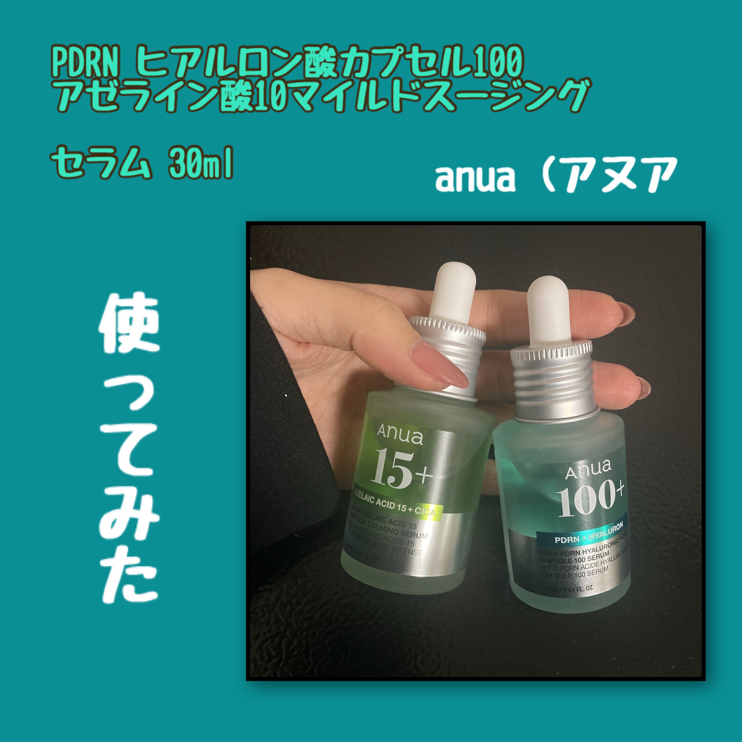 anuaアヌアさまの企画にていただきました。大人気セラム2種◆PDRNヒアルロン酸カプセル100セラム30ml◆アゼライン酸10マイルドスージングセラム30ml@anuamarketing#韓国スキンケア#韓国コスメ#美容液#セラム#モニター#当選報告今回はPDRNセラムモニターしてみました🙆♀️(勝手にーーーーーーーーーーーーーーーーー【アイテム特徴】🔵◆3つの成分がキーとなる・PDRN(1DNA-Na/整肌成分)→サーモン由来・ヒアルロン酸(加水分解ヒアルロン酸/保湿成分)→高/中/低分子さまざまな大きさの11種・コラーゲン(加水分解コラーゲン/整肌成分)◆保湿が欲しい/ツヤ肌になりたい/水分持続させたいそんな方にピッタリ!!!肌コンディション/ツヤ/みずみずしさ/ハリ◆超低分子スマートカプセル→リポソーム技術と類似したスマートカプセルが角質層まで成分を届け吸収をサポートする。◆みずみずしいテクスチャー→肌にすっと馴染み、長時間しっとりする。◆おすすめ使用法化粧水前にプレ導入として使う。ファンデやトーンアップクリームに数滴混ぜる。ーーーーーーーーーーーーーーーー🟢アゼラインはニキビとか肌荒れが気になる時に使っております。前々から愛用しておりました🙇✨💚いつも助けられております。ちょいと、オイルっぽい感じで保湿されすぎ?と思うけれども、、それは勘違いと言うことでこの後も私はしっかり保湿クリーム塗りたくっております。アゼライン使うとやはりお肌落ち着くんだよなー。頬の赤みとかも出なくなる。🔵PDRNは、実はお初でした👀!色んな美容好きな方がガチでおすすめしていて気になっていたアイテムのひとつです。使えば使うほどにお肌に水分貯蓄出来ているようなイメージ。なので長期戦アイテムかと。継続は力なり。アゼラインと違ってオイル感はなくベタつきも全くないので使いやすいです。私はお肌がみずみずしくなって、ふっくらきめ細やかなお肌になってきました。