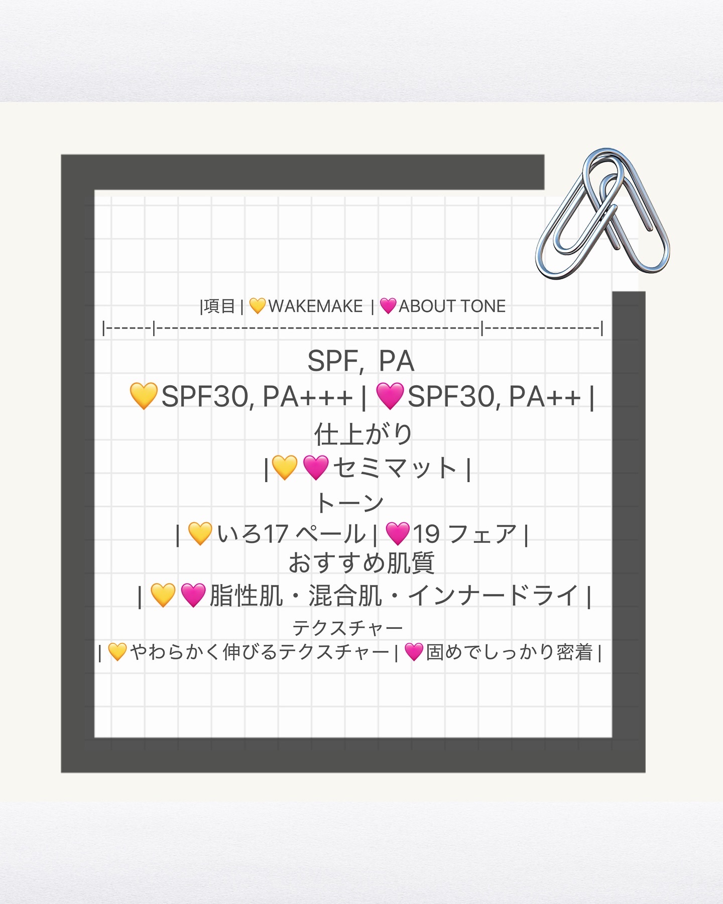 🇰🇷韓国で話題のセミマットファンデ2種を徹底比較‼️透ける素肌フィット派?✨それとも毛穴レスカバー派?👀⸻💎【商品情報】💛WAKEMAKEシームレスウェアファンデーションSPF30/PA+++→毛穴レスな均一セミマット💫⭐️総合評価:★★★★★(カバー力と付け心地の軽さがメイク初心者🔰さんでも塗りやすいと思った!)🩷ABOUTTONEスキンレイヤーフィットファンデーションSPF30/PA++→透けるようなシルク肌✨⭐️総合評価:★★★★⭐︎(メイク上級者さん向けかも!でもこの素肌感とピタッとした密着感が厚塗りにならなくてとっても良い⭕️)⸻🪞【テクスチャー比較】💛WAKEMAKE:薄膜なのにしっかりカバー🌟毛穴の影を明るく飛ばす“錯視効果”あり!※崩れにくく、長時間キープ力◎※メイクアップ効果による🩷ABOUTTONE:固めのテクスチャーが、ピタッと素肌に密着!💫素肌に溶け込むようになじむ美しい仕上がりで1日中ビジュアル維持⭕️⸻💧【仕上がりの違い】💛wakemake→「毛穴レス×均一セミマット」🩷ABOUTTONE→「素肌感×ナチュラル美肌」どちらもセミマットだけど、✔️カバー重視なら💛wakemake✔️自然派なら🩷ABOUTTONE⸻🫶【おすすめ肌質】💛🩷どちらも脂性肌・混合肌・インナードライ肌さんにおすすめ!⸻✨【まとめ】透けるor隠す、あなたはどっち派?💛🩷両方とも“セミマット”で崩れ方も大きく差はありませんでしたがテクスチャーが全然違うので自分の好みに合わせて選んでね👌少しでも気になったよ〜という方はいいね❤️/コメント💬/保存💾/フォロー☑️たくさんお待ちしてます✨⸻#韓国コスメ#ファンデ比較#ベースメイク#ABOUTTONE#WAKEMAKE#セミマットファンデ#崩れにくいファンデ#素肌感メイク#毛穴レス肌#購入品#Qoo10#コスメ#cosme#韓国コスメ好きな人と繋がりたい#コスメすきな人と繋がりたい#コスメオタク#コスメオタクと繋がりたい#コスメヲタク#コスメヲタクと繋がりたい#美容垢#美容#LIPS#kbeauty