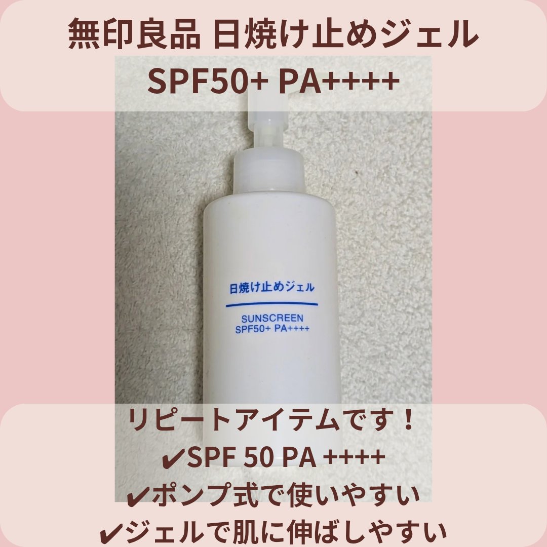 無印良品 日焼け止めジェル SPF50+PA++++とてもさらっとした白いジェルです。伸びが良くべたつきません。使い心地がいいので少し家を出る時によく使ってます。#日焼け対策#日焼け止めジェル#紫外線対策