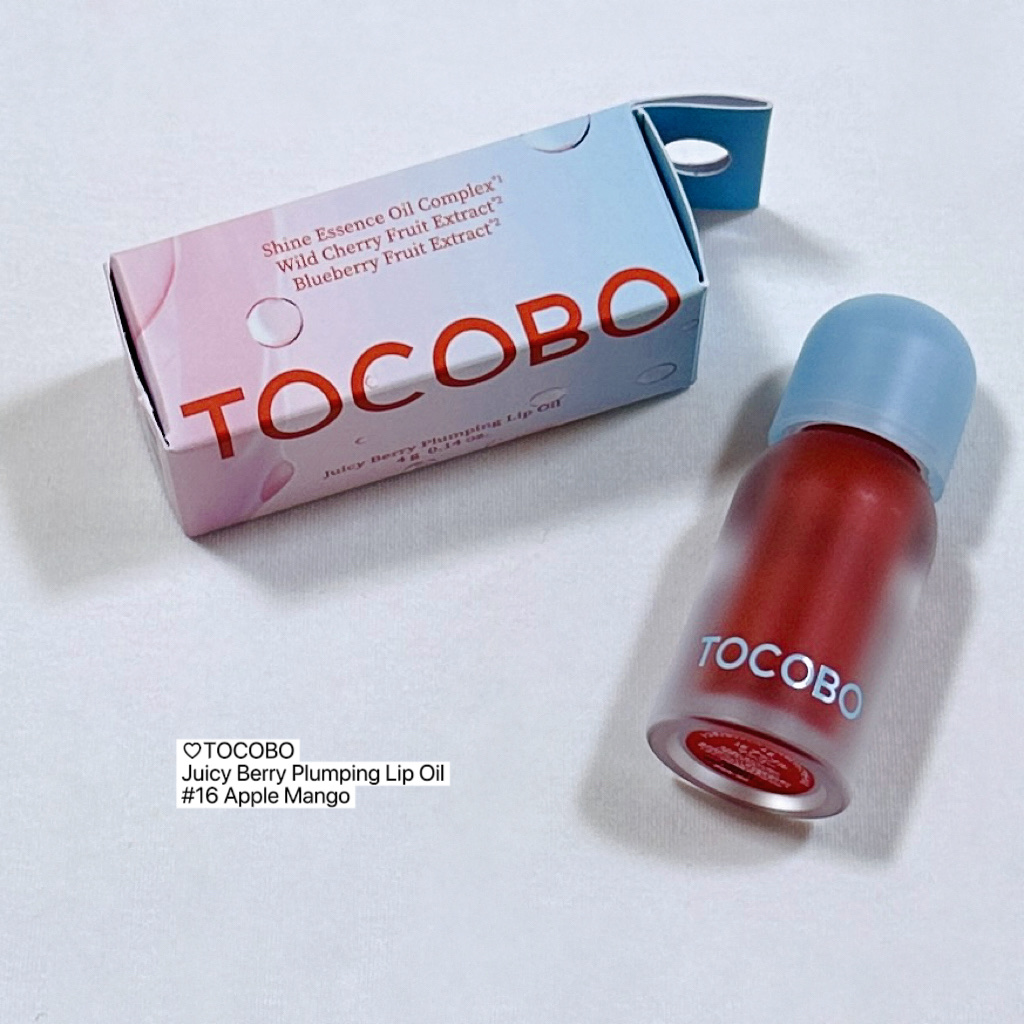 TOCOBOの「ジューシーベリープランピングリップオイル」かわいい😍今まで日焼け止めとかベースメイクのイメージだったけどプランパー効果のあるリップオイルがあるの初めて知りました!03ブラックチェリー、日本限定色の16アップルマンゴー✨ボトルだ...