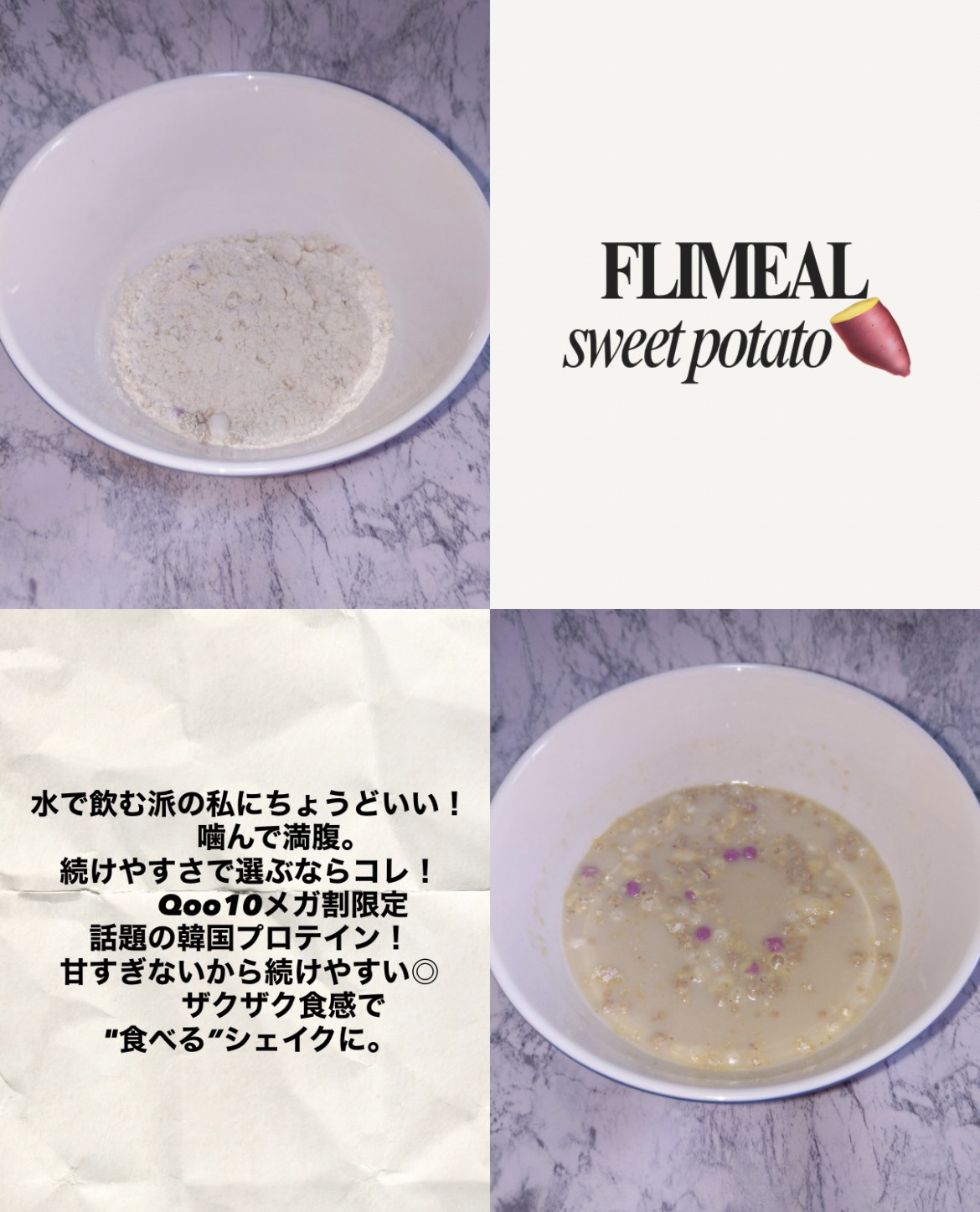 FLIMEALFLIMEALプロテインシェイク#スイートポテト 甘くてまろやかスイートポテト味Qoo10メガ割で購入甘すぎず飲みやすかった芋感はあまり感じられない気がしました