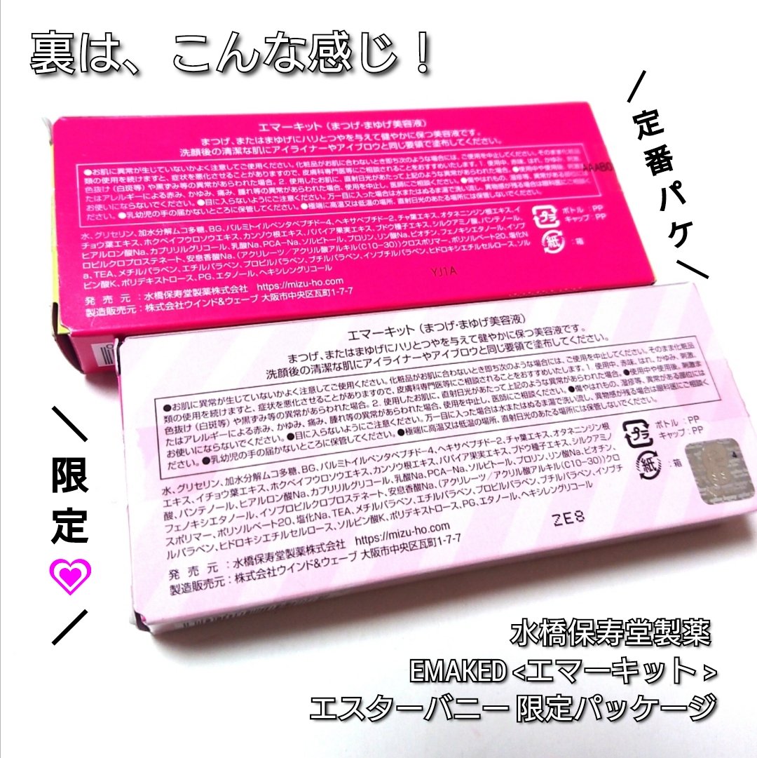 EMAKED×エスターバニーの限定パケ登場💗まつ毛美容液、約8ヶ月使用報告もしながらご紹介していきたいと思います!✼••┈┈••✼••┈┈••✼••┈┈••✼••┈┈••✼水橋保寿堂製薬EMAKED<エマーキット>エスターバニー限定パッケージ6,600円(税込)✼••┈┈••✼••┈┈••✼••┈┈••✼••┈┈••✼まつ毛美容液といえば、コレを思い浮かべる方も多いはず☝️寝る前のひと手間で感動の自まつ毛を目指せる元祖&ロングセラーなまつ毛美容液。「EMAKED<エマーキット>」逆から読むと「DEKAME<デカ目>」♥️開発者さんの思いが伝わる、ユーモアさも好き!✨使用する時の注意点は、約3ヶ月間毎日使っていくものなので、衛生面で2度付け禁止(串カツみたい。笑)毎晩、お風呂から上がった後もしくは、洗顔後すぐ・スキンケアはじめる前の一番最初の使用がオススメ◎エマーキット1本が毎日使用で約3ヶ月分で、只今、3本目リピ中。👁️(子育て奮闘中の為、夜塗るの忘れて寝る事多々あり…)実際使ってみての感想。【良かった所】☑️EMAKEDは、夜一回の使用でいいこと!☑️個人的に一番自分に合ってた気がする!【悪かった所】☑️継続していないと、まつ毛が気になる。☑️塗布すると、しばらく違和感。☑️やっぱり値段がリッチ。↑エマーキット公式サイトのお得な定期購入を検討中💡(類似品が多いみたいで正規証明カードがもらえる!)まつ毛の生え替わりの周期って約4ヶ月らしく、新たなまつ毛に出会えるのは約半年先の長期戦だから、まつ毛美容液愛用ってお金も時間も正直掛かるけど…個人的には、これからもエマーキット継続していこうと思います!そして、エスターバニーの限定パケ可愛かったから、定期的にキャラクターとコラボ希望です😳💕映える睫毛は、素っぴんも可愛くなるしメイクも楽しくなる♪皆さんもぜひ、「水橋保寿堂製薬EMAKED<エマーキット>」で憧れ自まつ毛GETしてみてくださいね💪✨最後までご覧くださりありがとうございました!!この投稿が何かの参考になれば嬉しいです🙇✨#EMAKED#エマーキット#水橋保寿堂製薬#エスターバニー#まつ毛美容液#盛り耐性#睫毛#まつ毛#限定#コラボ#推し成分で乗り切る夏