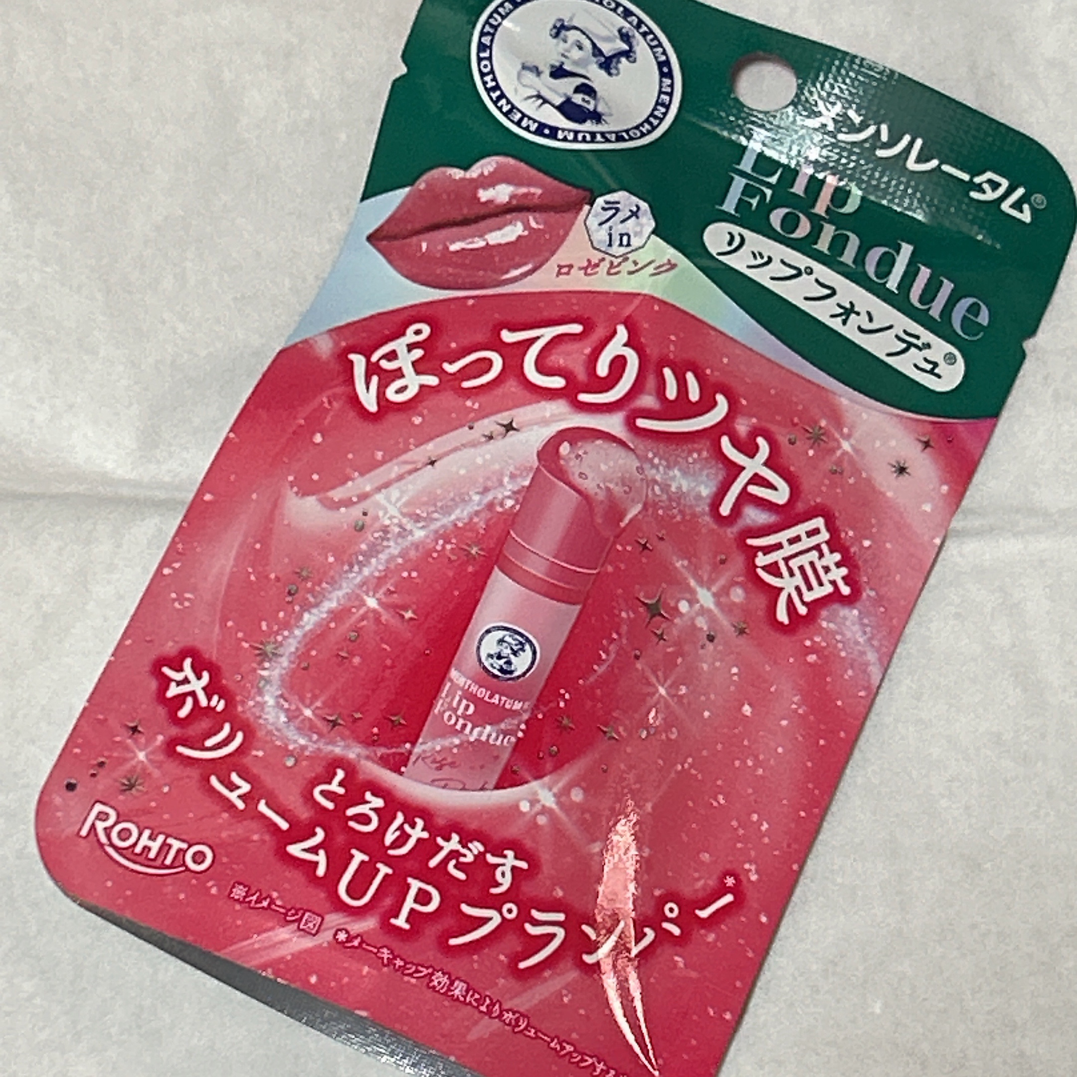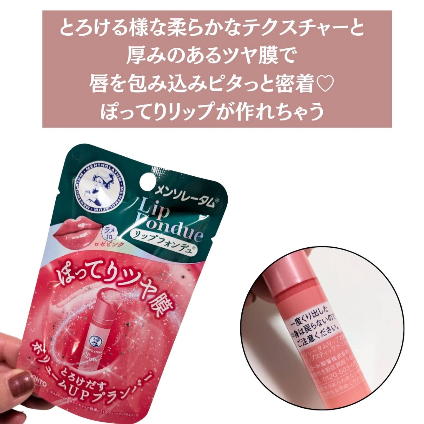 メンソレータムリップフォンデュロゼピンク色付きはほぼありませんがラメがチラチラ✨️プランバー効果で自然にふっくらとした唇に。しっかりと保湿されるので冬の乾燥も怖くない!