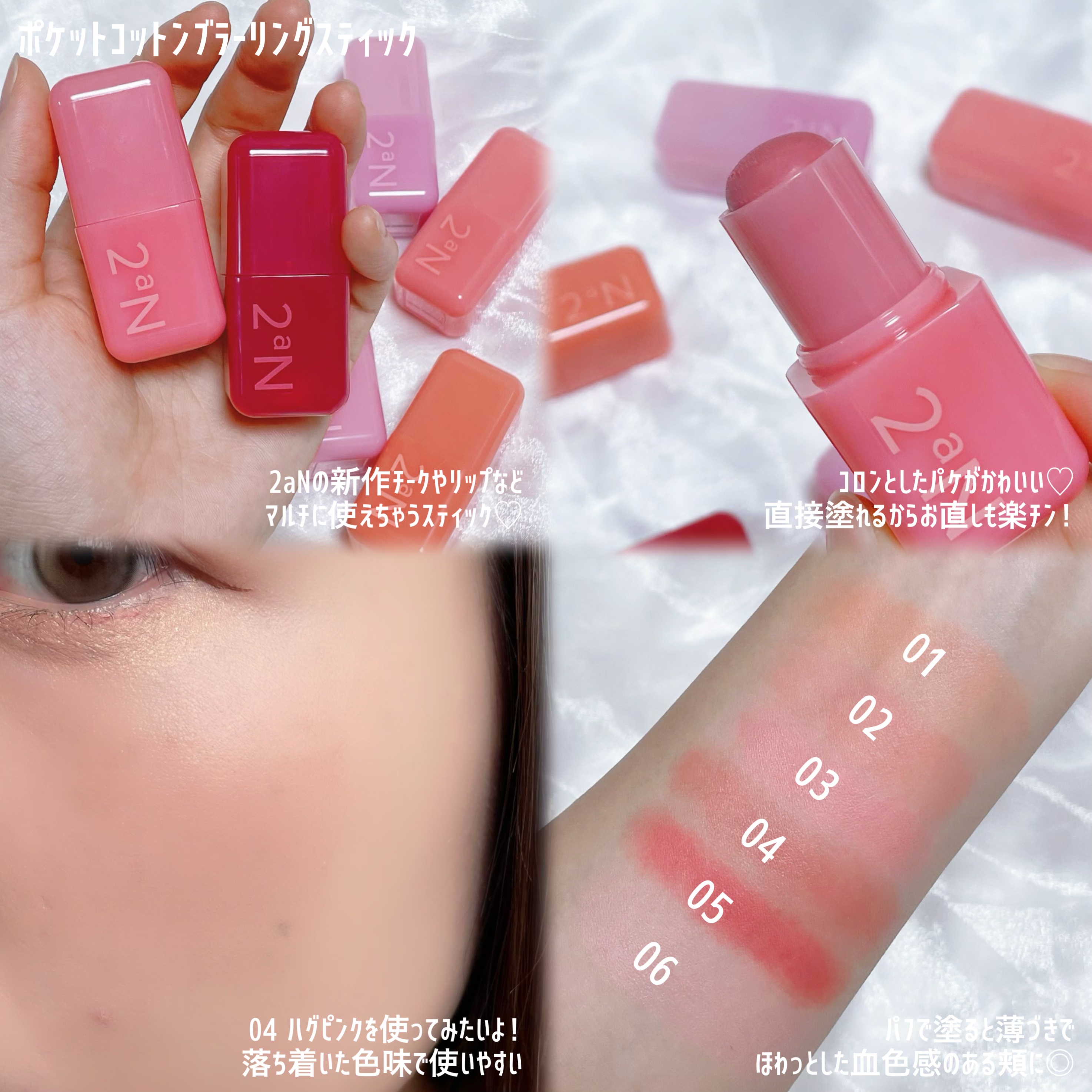 「2aN」新商品💖チーク、リップ、アイメイクにも使える!マルチスティック全6色をレビュー✨01、02、03、04、06はナチュラルなカラー05は鮮やかなカラーだよ!購入する時の参考にしてみてね😉💓2aNポケットコットンブラーリングスティック✔...