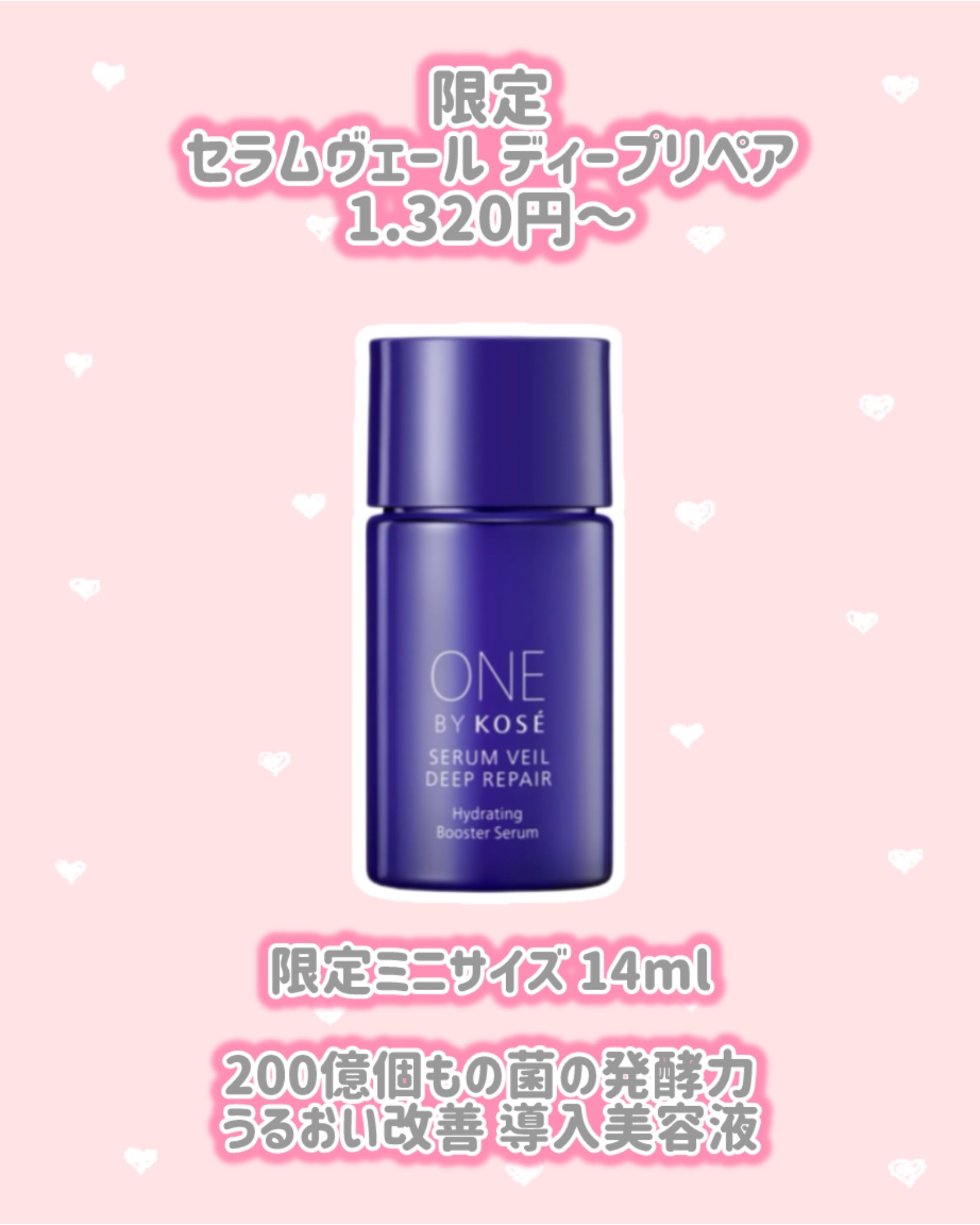 ONEBYKOSE新作情報⟡.·*.··············································⟡.·*.発売日08/21肌の潤いバリアに着目した高保湿化粧水&乳液を発売♥セラムシールド990円~♡7gサイズうるおいもシワも改善する日本初の有効成分ライスパワーNo.11+配合根深い乾燥を高保水膜でケア♡限定セラムヴェールディープリペア5,500円~♡レギュラーサイズ限定キットキット内容・セラムヴェールディープリペア60mL[医葉部外品]・セラムヴェールローション30mL・セラムヴェールエマルジョン24mL♥限定セラムヴェールディープリペア1.320円~♡限定ミニサイズ14ml200億個もの菌の発酵力うるおい改善導入美容液♥セラムヴェールローション♡本体180ml3,300円~♡つめかえ160ml2,860円~過酷乾燥でももっちり潤密肌へライスパワーを重ねうるおい深く根づかせる高保湿化粧水♥限定セラムヴェールローション572円〜♡30mL限定ミニサイズ♥セラムヴェールエマルジョン♡本体135ml3,850円~♡つめかえ115ml3,190円~過酷乾燥でも、もっちり潤密肌へライスパワーを重ねうるおい深く根づかせる高保湿乳液♥限定セラムウエールエマルジョン726円~♡限定ミニサイズ24ml♥限定セラムヴェールうるおい体感キット1,320円〜乾く隙のないほどうるおい満ちるもっちり潤密肌体感キットキット内容・セラムヴェールディープリペア9mL医薬部外品・セラムヴェールローション30mL・セラムヴェールエマルジョン24mL⟡.·*.··············································⟡.·*.画像はLIPS様よりお借りしましたまた新作情報を投稿させて頂きます#新作コスメ#ワンバイコーセー#スキンケア#限定キット#ミニサイズ#化粧水#乳液#もっちり肌#ドラッグストア#ドラコス#ドラッグストアコスメ#ドラッグストアスキンケア#コスメ情報#コスメ紹介#おすすめ新作#限定