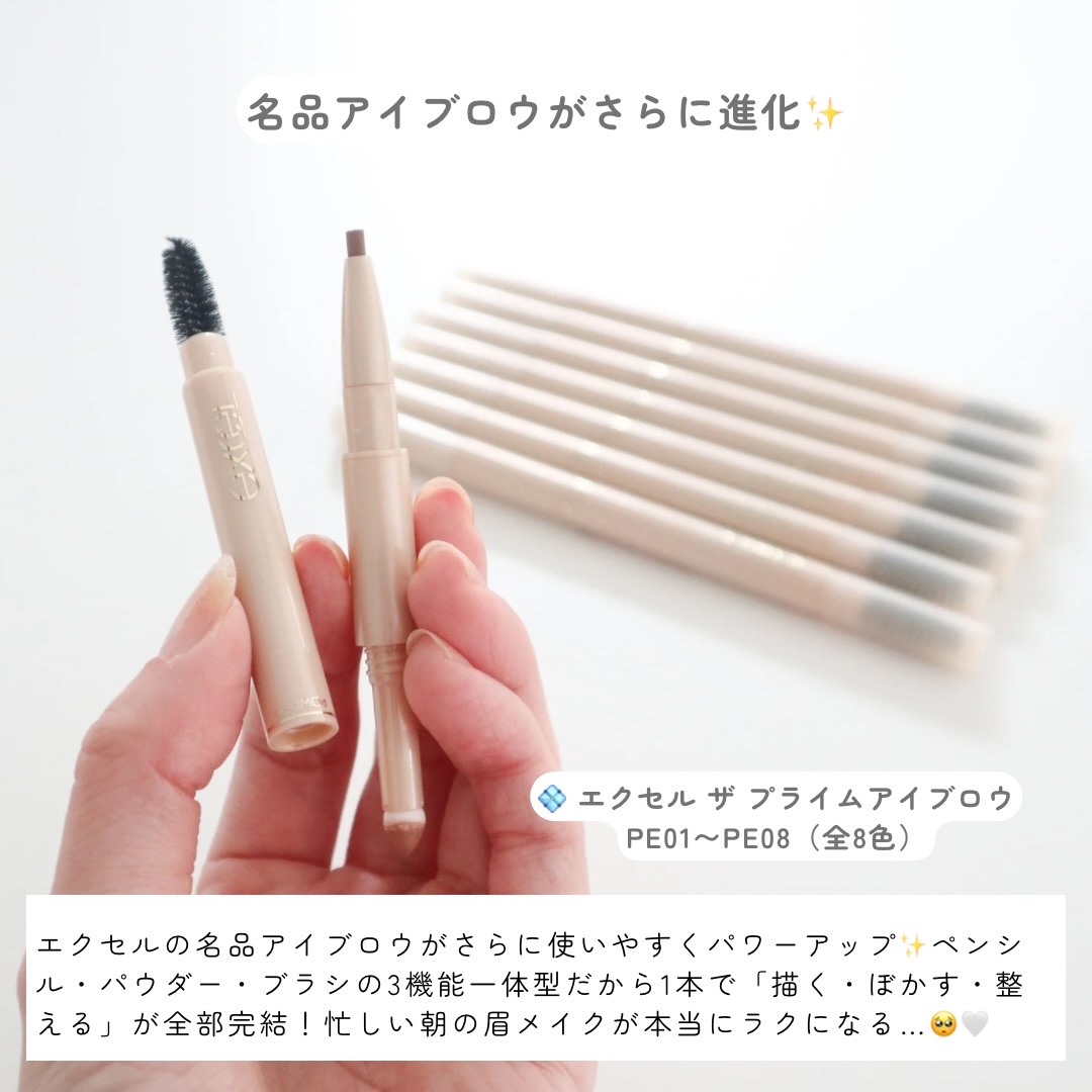 \名品アイブロウがさらに進化✨/💠エクセルザプライムアイブロウPE01〜PE08(全8色)/各1,650円(税込)エクセルの名品アイブロウがさらに使いやすくパワーアップ✨ペンシル・パウダー・ブラシの3機能一体型だから1本で「描く・ぼかす・整える」が全部完結!忙しい朝の眉メイクが本当にラクになる…🥺🤍【✨パワーアップポイント】✔ペンシルなめらかさがアップしてするする描ける抜群の描き心地✨ウォータープルーフ処方で長時間キープしてくれるのも安心◎✔パウダー新処方でふんわり感がアップ!眉全体に自然な立体感が出ていかにも「描きました感」が出にくいのがさすが👏✔スクリューブラシコシがやわらかくなって肌あたり&ぼかしやすさがアップ✨眉メイク初心者さんでも失敗しにくい設計に🤍カラーはベーシックからトレンドまで揃う全8色。人気カラー(01・02・05・07)はそのまま継続しつつ今っぽいアッシュ系・赤み系カラーが仲間入り🫶PE01ナチュラルブラウン:自然なブラウンヘアにPE02キャメルブラウン:やや明るめの黄み系ブラウンヘアにPE03ウォームブラウン(新色):赤み系のブラウンヘアにPE04アッシュピンク(新色):明るめの赤み~ピンク系ヘアにPE05グレイッシュブラウン:明るめのブラウンヘアや黒髪にPE06アッシュベージュ(新色):明るめのアッシュ系ヘアにPE07モカブラウン:やや明るめの自然なブラウンヘアにPE08ライトブラウン(新色):明るめの黄み系ブラウンヘアにパッケージも洗練された印象にアップデート&割れにくい設計に…!毎日使うものだからこの配慮は本当にありがたい🥹デイリー使いしやすくて眉メイクの失敗も減らしてくれる安心感。アイブロウ迷子さんにもぜひチェックしてほしい名品です🤍✨@excelmake様よりご提供いただきました。#エクセル#ザプライムアイブロウ#アイブロウ#眉メイク#プチプラコスメ