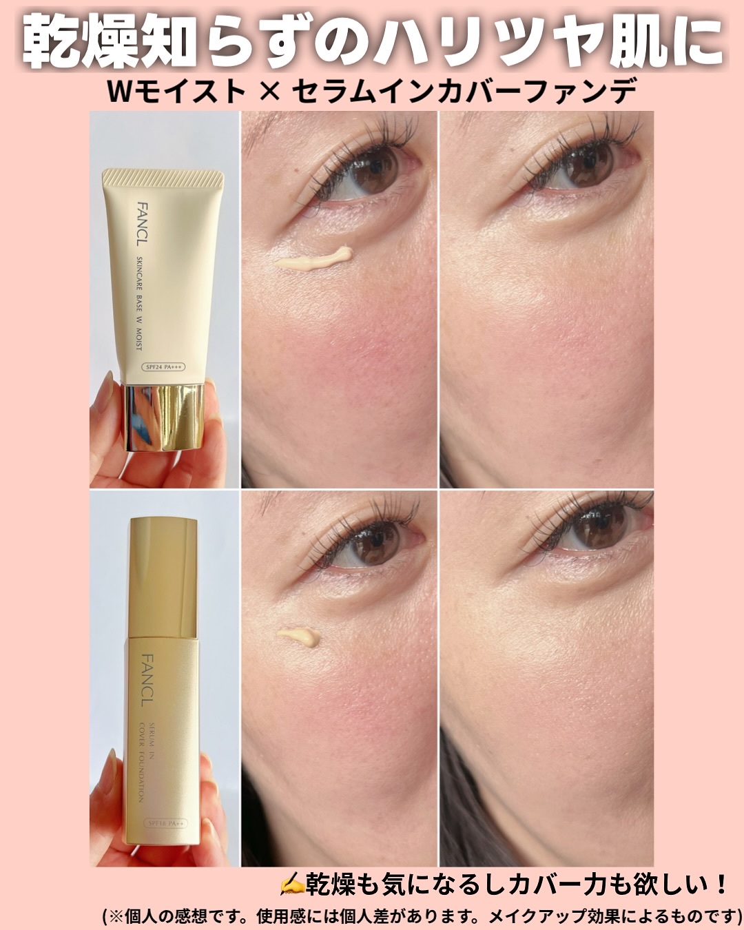 \崩れ知らず&うるツヤ肌に感動🥹✨/ファンケルからついに美容液ベースメイクが誕生!スキンケア発想で、無添加*¹なのにツヤ・カバー・密着感まで妥協なし💎私のお気に入りな組み合わせは"Wモイスト下地+セラムインカバーファンデ"🪞乾燥しがちな私の肌...