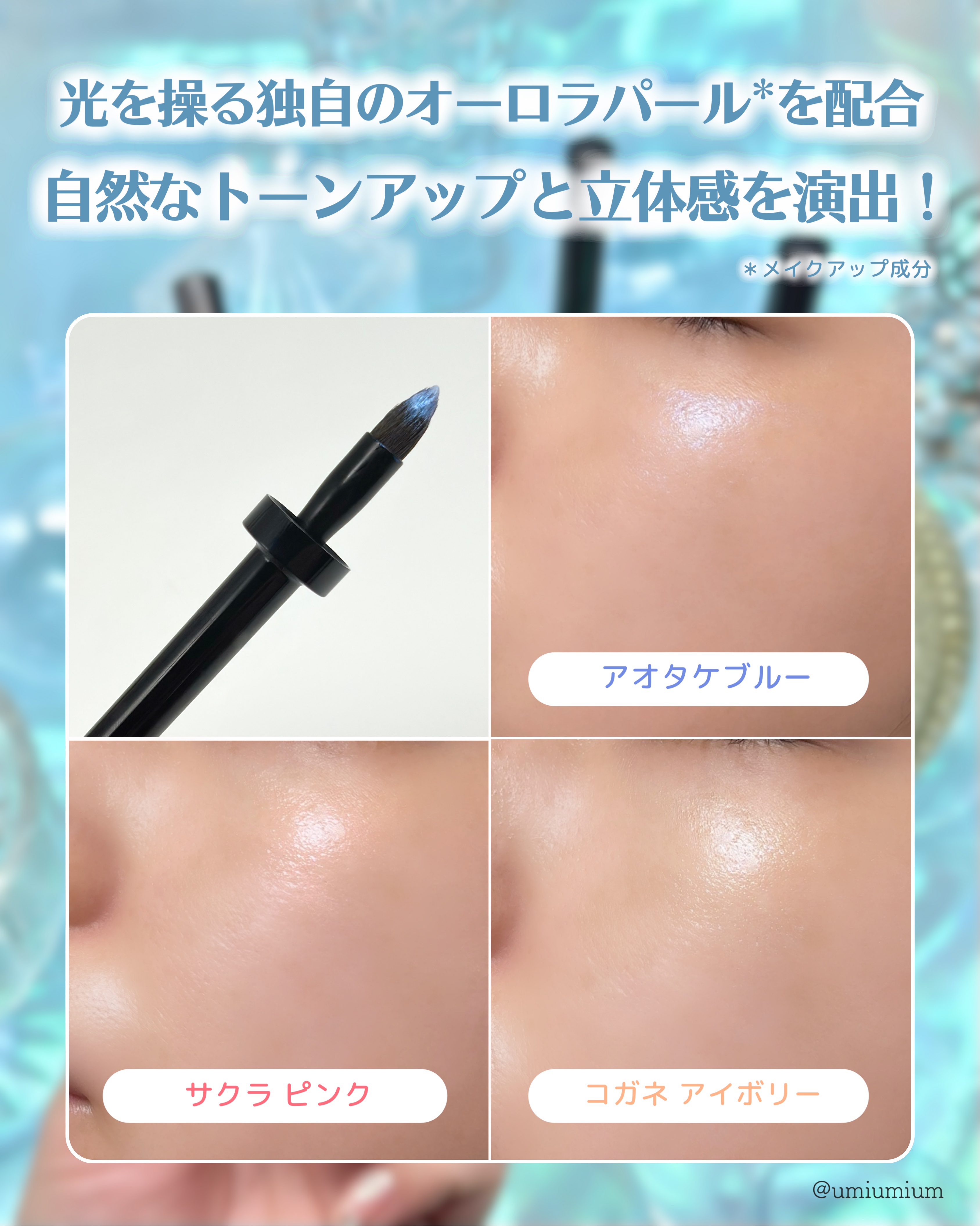 \なんじゃこりゃあ!なハイライト🥺/shuuemuraから発売される筆アプリケーターの美ハイライト🩵🩷💛イチオシはやっぱりアオタケブルー😍🩵🩵🩵この光り方はほんと眺めてられる…🤣美容成分も入ってるから、メイクしながらケアできちゃう。この筆がま...