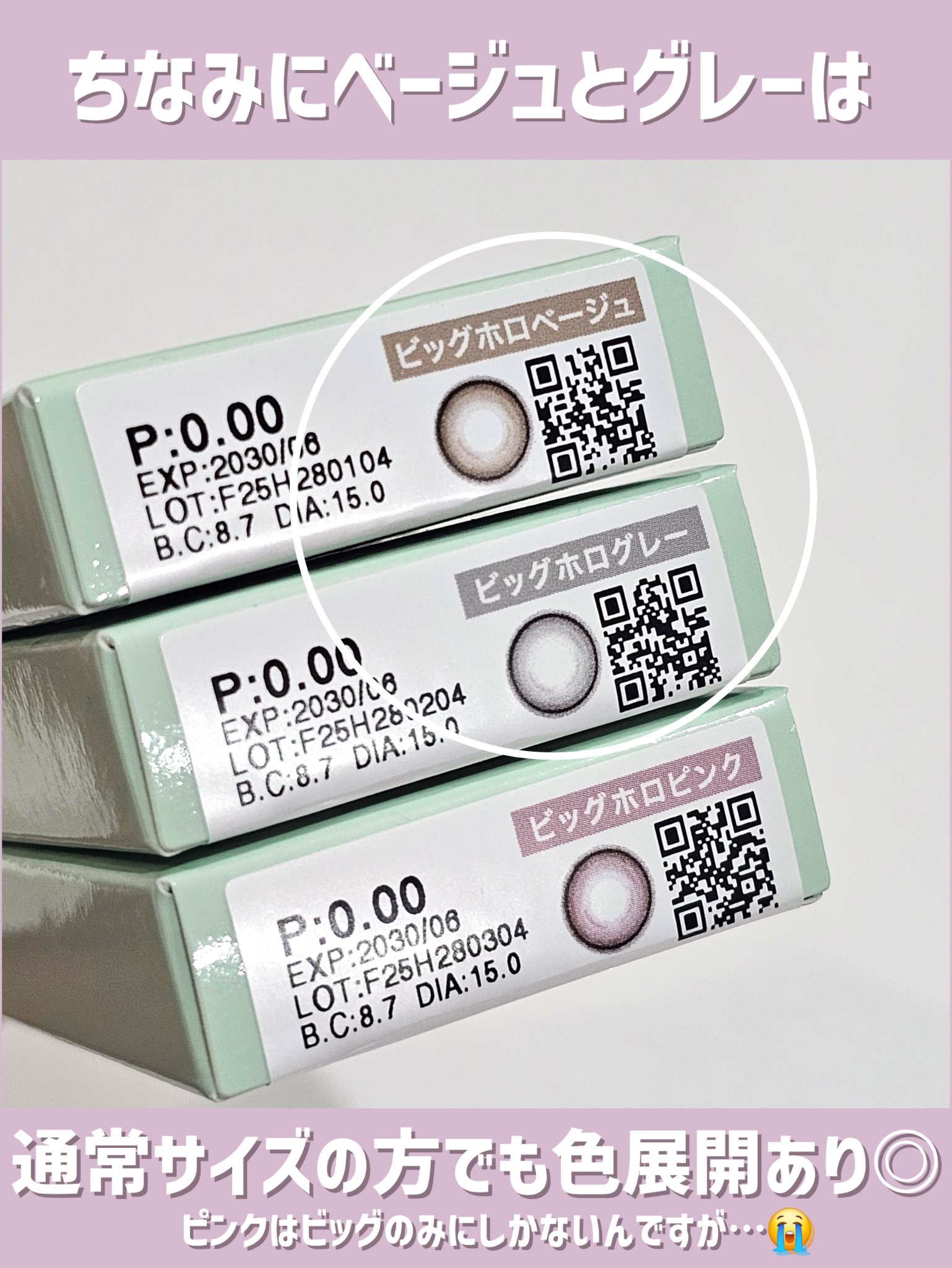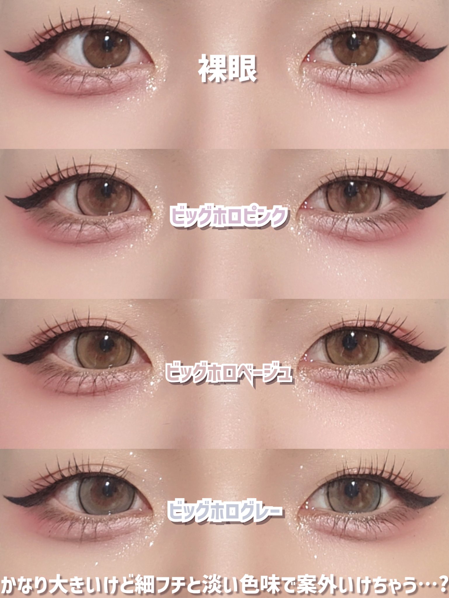 【\着色直径大きいのに色素薄い系?!/人気シリーズからビッグ新登場で全色レビュー】◎eyecloset ビッグホロピンク ビッグホロベージュ ビッグホログレー 1DAY 10枚入りカラコン通販サイト、ホテラバにて購入しました🙄先日ピンクのレビューをしたのですが、実は全色購入しておりましてただね、ピンク着けて思ったのがベージュとグレー買わんでもよかったなと…笑なぜならカラコン盛り耐性低めな自分からするとやっぱね、でかい😂😂細フチで色淡いからまだマシだけど…それでも、違和感は割りとある😂普段大きめを愛用してる方には👍でも、ホテラバって、3箱目無料になることが多いしちょうど全3色だしなーみたいなノリで3色とも買っちゃいましたわ😇だからお値段的にはかなりオトクだから全然いいんだけど使いきれない気が…😂大きめカラコンちょっと試してみたいな~という方、ホロシリーズのピンクはこれだけなので、ピンク使ってみたいという方に🥹🩷大きめでありながらここまで色素薄い系て実はそんなないような🙄追記:わりと爆速で通常サイズにピンクが出やがった参考になれたら嬉しいです🐰🪽🩵#アイクローゼット#eyecloset#ホロベージュ#ビッグホロピンク#ビッグホロベージュ#ビッグホログレー#細フチカラコン#カラコンレビュー#色素薄い系#儚げカラコン#正直レビュー#全色レビュー