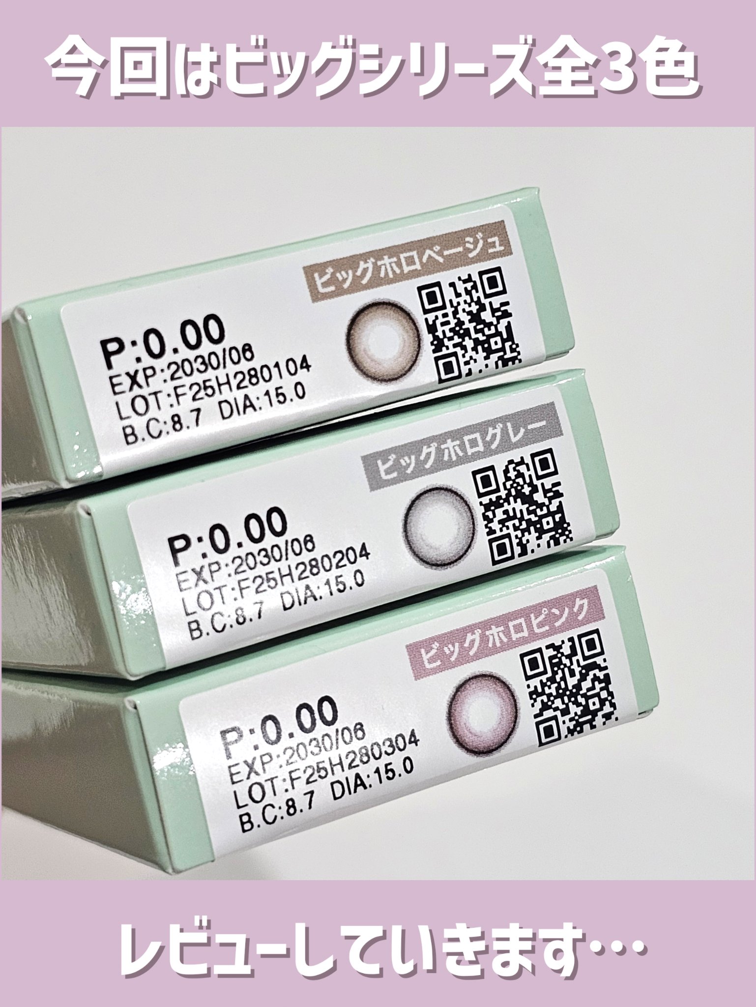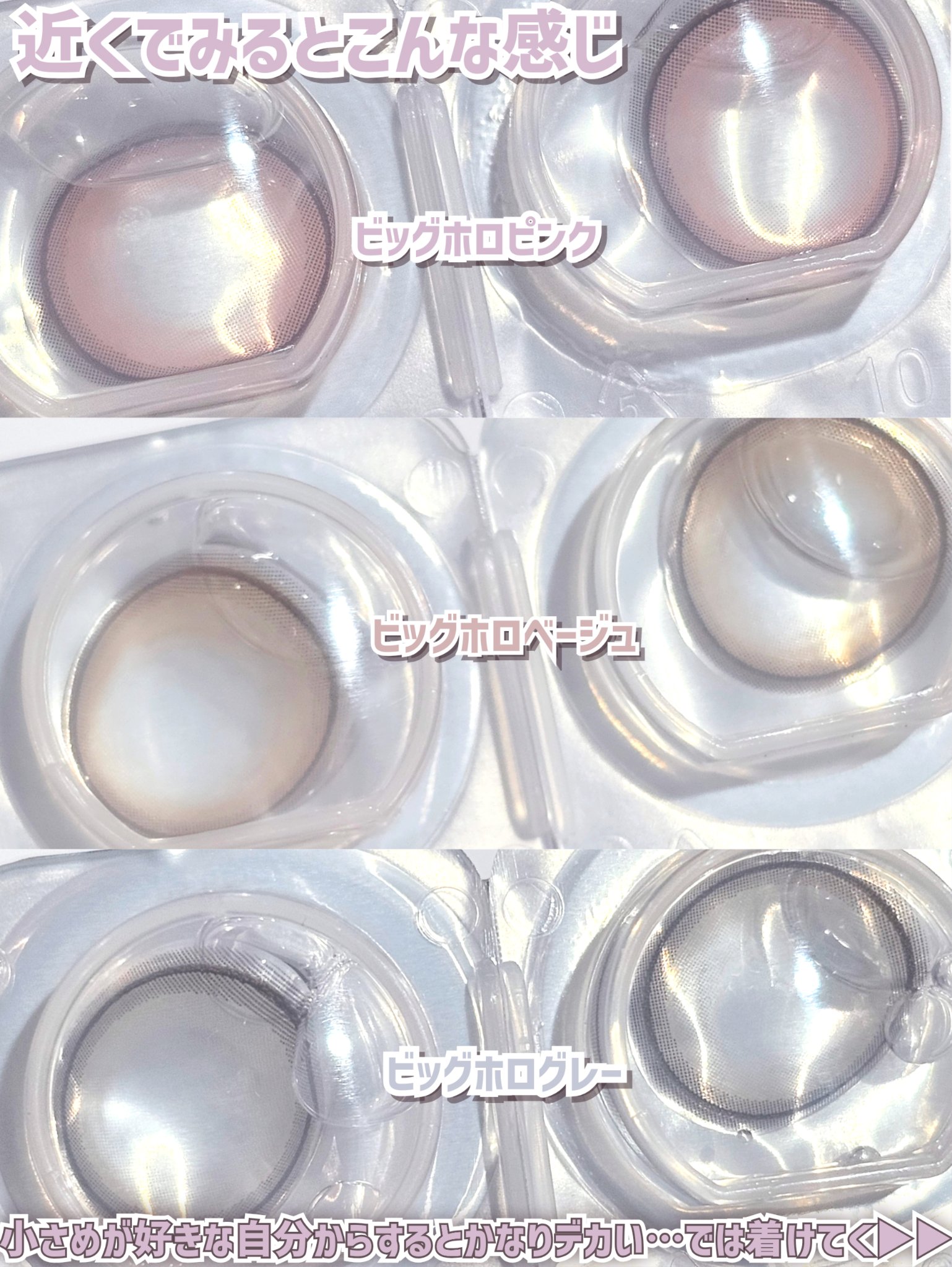 【\着色直径大きいのに色素薄い系?!/人気シリーズからビッグ新登場で全色レビュー】◎eyecloset ビッグホロピンク ビッグホロベージュ ビッグホログレー 1DAY 10枚入りカラコン通販サイト、ホテラバにて購入しました🙄先日ピンクのレビ...