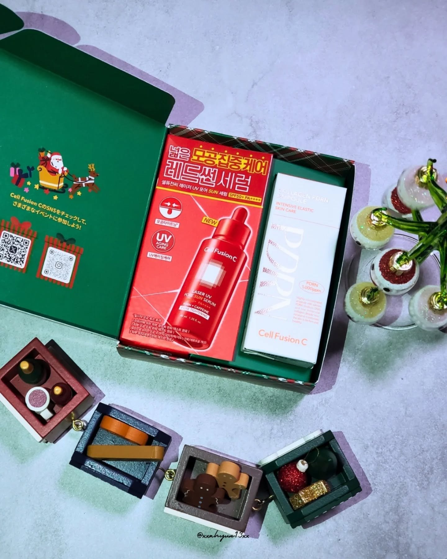CellFusionからXmasBOXが登場🎄🎁グリーンBOXにはコラーゲンPDRNレーザーUVポアサンセラムの2つが入っていて、弾力が気になる方におすすめのセット!メガ割クーポンとショップクーポン使用でかなりお買い得だし、箱も可愛いからプレゼントにも喜ばれそう!#PR#セルフュージョンC#Qoo10#メガ割