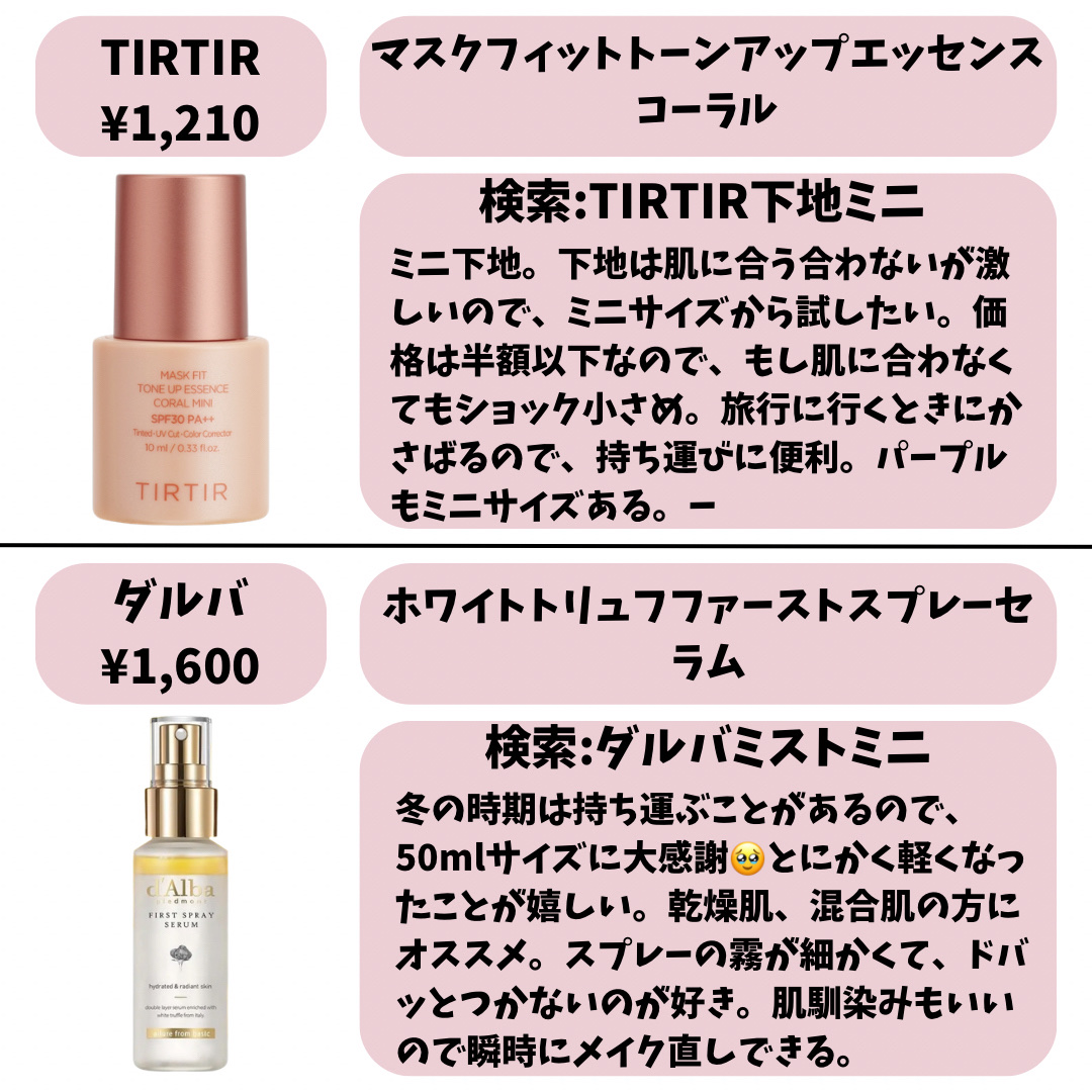 【ミニコスメ】良かったもの&今月買いたいもの紹介✼••┈┈••✼••┈┈••✼••┈┈••✼••┈┈••✼こんにちは。男子高校生きまっちゃんです🐰今回は、ミニコスメを紹介します。最近ミニコスメがたくさん発売されているので、おすすめコスメや今月発売で購入したいな‼️と思っているものをシェアしたいと思います☺️現品サイズよりはコスパ悪いかもしれませんが、少量で価格が安い方が試しやすいので、ミニコスメの流行がもっと広がってほしいなと願ってます♪🚨一部ミニコスメの写真がLIPS内になかったので、LIPS現品サイズの写真を使用している部分があります。詳しい写真は検索ワードを用いて調べていただけると嬉しいです。参考になった方や、気になる商品があった方は、は、いいね👍やコメントで教えてくださると嬉しいです☺️投稿を保存📎しておくとお買い物の際に見返せた便利です♪────────────※画像はLIPS様よりお借りしました。✼••┈┈••✼••┈┈••✼••┈┈••✼••┈┈••✼Wonjungyo¥550ウォンジョンヨモイストアップレディスキンパックDMN10枚入り検索:wonjungyoパックミニ部分パック。スキンケアは肌に合う合わないが激しいので、ミニサイズから試したい。一回に大体4枚(両頬、顎、鼻、鼻下)使うので、3泊までのお泊まりの朝メイク前にオススメ。切り取れるので、鼻と鼻下は1枚で2箇所使う。────────────rom&nd¥825ザジューシーラスティングティントM23ピーチピーチミー検索:rom&ndリップミニリップは持ち運ぶことが多いので、小さくて良い。特にティントタイプは変色や衛生面的にも早く消費したいところがあるので、使い切りやすいサイズで助かる。色持ちはよくないけど、綺麗に無くなるので、何度も塗り直しても綺麗。────────────rom&nd¥825ハンオールブロウカラ03モダン・ベージュ検索:rom&nd眉マスミニ眉マスカラ。小さくなったことでポーチに入れやすくなった。私は眉マスカラを塗り忘れて、外出先で塗ることが多いので、持ち運び便利。ミニになった分ブラシが小さくなって曲がってる?ので、若干使用感が違う。真っ直ぐが好み…────────────JUDYDOLL¥990メリハリマスターパレットミニ検索:JUDYDOLLファミマ上段2色のミニバージョンがファミリーマートにて発売。販売は12月12日(土)サイズ感はわからないのですが、縦長でコンパクトなので、鏡兼お直しパウダーとして良さそう。正直、上段のみそこ見えしているので、乗り換える予定。────────────ETUDE¥990カールフィックスマスカラブラック/ブラウン検索:ETUDEマスカラミニミニマスカラ。多分下まつ毛用?ブラシが小さいので、下まつ毛一本一本にしっかり塗れる。マスカラも衛生面が気になるので早く使い切りたいので小さくてもいい。私は検証時以外は、マスカラを使わないので、ミニサイズが好き。────────────2aN¥1,100ラブクローバーパレット01ピンクブルーム検索:2anセブンイレブン🩷3色のハート型アイシャドウパレットがセブンイレブンにて発売。販売は12月10日(水)色が半分になって、半額なので最低限のカラーでいい方はオススメ。アイシャドウは持ち運びはしないので、02バニラクリームを購入予定。────────────TIRTIR¥1,210マスクフィットトーンアップエッセンスコーラル検索:TIRTIR下地ミニミニ下地。下地は肌に合う合わないが激しいので、ミニサイズから試したい。価格は半額以下なので、もし肌に合わなくてもショック小さめ。旅行に行くときにかさばるので、持ち運びに便利。パープルもミニサイズある。────────────ダルバ¥1,600ホワイトトリュフファーストスプレーセラム検索:ダルバミストミニ冬の時期は持ち運ぶことがあるので、50mlサイズに大感謝🥹とにかく軽くなったことが嬉しい。乾燥肌、混合肌の方にオススメ。スプレーの霧が細かくて、ドバッとつかないのが好き。肌馴染みもいいので瞬時にメイク直しできる。────────────dasique¥2,200ミニシャドウパレットミルクラテ検索:dasiqueアイシャドウミニ手のひらサイズの9色アイシャドウ。dasiqueのアイシャドウは値段の割に粉質が…と賛否分かれることが多いので、ミニサイズから使ってみるといいかも?色々なアイシャドウを使うので、なかなか使いきれないので、ミニでいいかも。────────────チャコット・コスメティクス¥2,750コンプレクションクリエイター003クリア検索:チャコットパウダーミニ持ち運びパウダー。通常サイズの大体半分サイズのパウダー。価格も半分(正直、¥1,400ぐらいだと超オススメした)鏡&パフ付き。ルースパウダーのミニサイズもある。持ち運ぶならプレストタイプ。家で使うならルースタイプがオススメ。✼••┈┈••✼••┈┈••✼••┈┈••✼••┈┈••✼#ご褒美コスメ会議#ミニコスメ