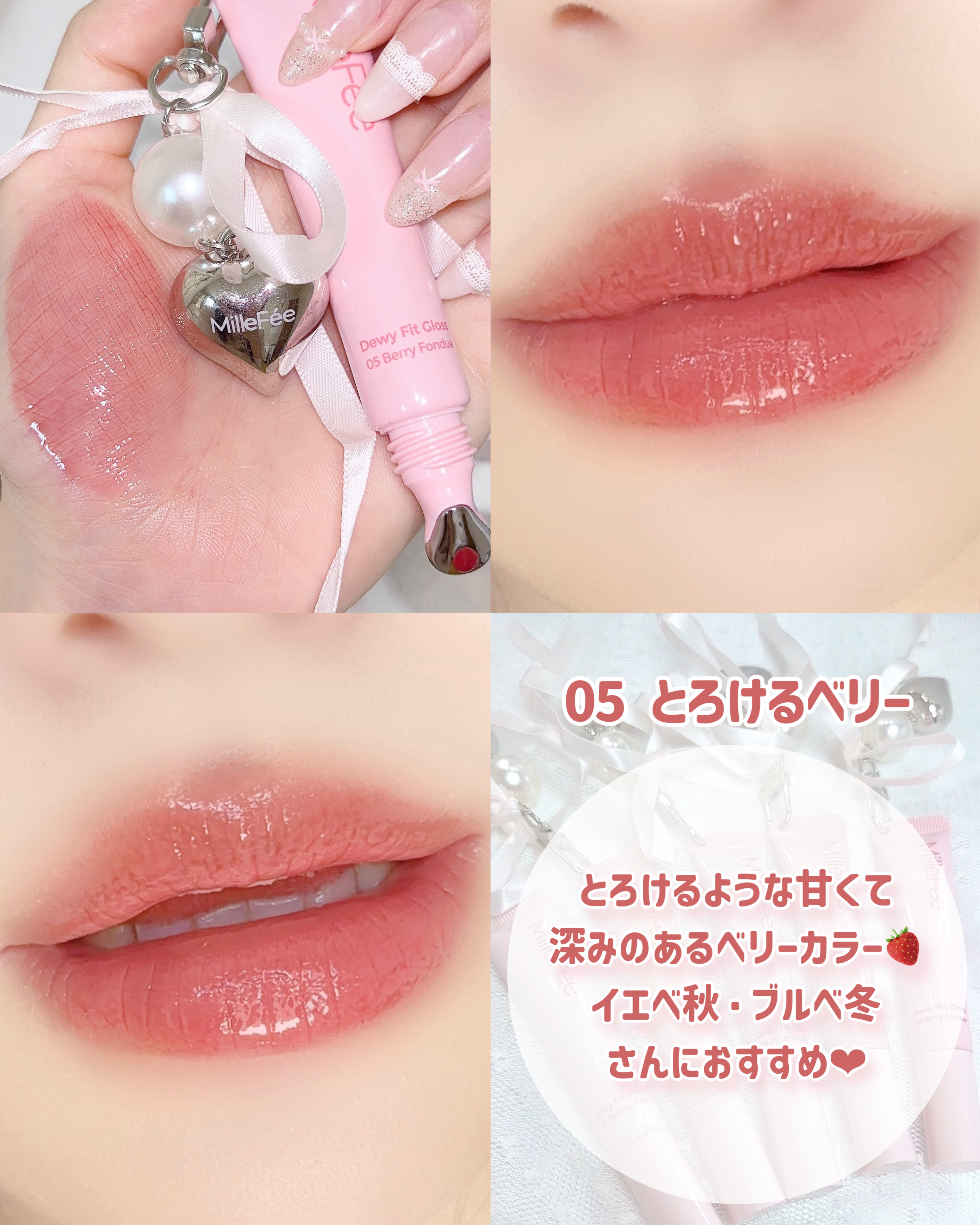 🎀かわいすぎる!チャーム付きちゅるんリップ💘.🎗MilleFéeうるうるフィットグロス03¥1,650どタイプの色味きた〜!🥹♡ブルベさん(どちらかというと冬)向けのほんのり色づくグレープカラー🍇グロスだから光に反射するとちゅるんと透明感のあ...