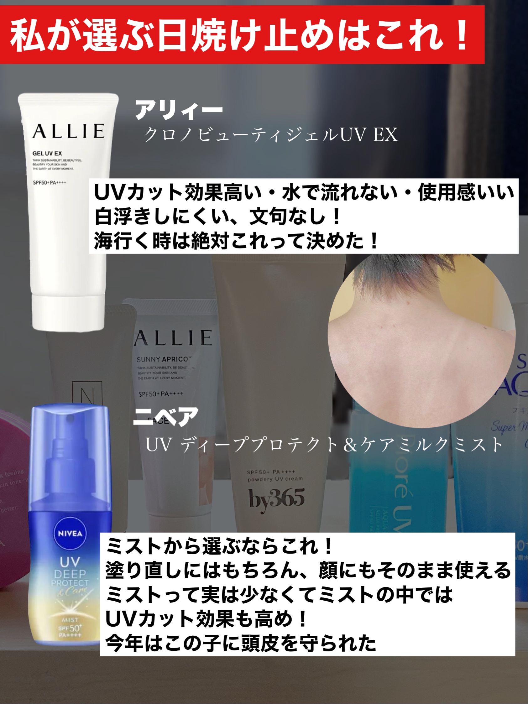 自称海人(うみんちゅ)が身体を張って検証した実力派日焼け止め実はSUP歴5年の私が本当に焼けにくかった日焼け止めをガチ検証!実際に海に行って37℃の酷暑の中、昼間からたっぷり遊んで検証したのがコチラ!▼ROUNDLAB白樺水分uvクリーム▼ニベアUVディーププロテクト&ケアジェル▼アリィークロノビューティジェルUVEX▼メンタームベルディオUVモイスチャージェルN▼ナリスアップby365パウダリーUVクリーム▼スキンアクアスーパーモイスチャージェル▼ビオレUVアクアリッチアクアプロテクトミスト▼ニベアUVディーププロテクト&ケアミルクミストこの中で本当に焼けにくかったのが正直ダントツでアリィークロノビューティジェルUVEX水で流れない・UVカット効果大・使用感いい白浮き気にならない・ヒリヒリ、赤みでないで文句のつけどころがありませんでした!ただ!アリィーは髪や頭皮には使えないから髪や頭皮に使える日焼け止めミストの一推しはニベアUVディーププロテクト&ケアミルクミスト塗り直しにももちろん良いんだけどミストの中ではUVカット効果高めでかつ!意外と少ない顔にもそのままシュッと使えるタイプ今年はこの子に私の頭皮を守ってもらったみんなはどれが気になった?紫外線対策しつつ夏を楽しみたい方は是非チェックしてみてねー!#暑さを乗り切る夏美容#紫外線対策#シミ予防UV#UV#日焼け止めジェル#日焼け対策#UVケア#本気の日焼け対策#プチプラ#美容#正直レビュー#シミ予防#美白ケア#プチプラコスメ#ボディケア#日焼け止めミスト#ドラコス#ドラコスこれ買って