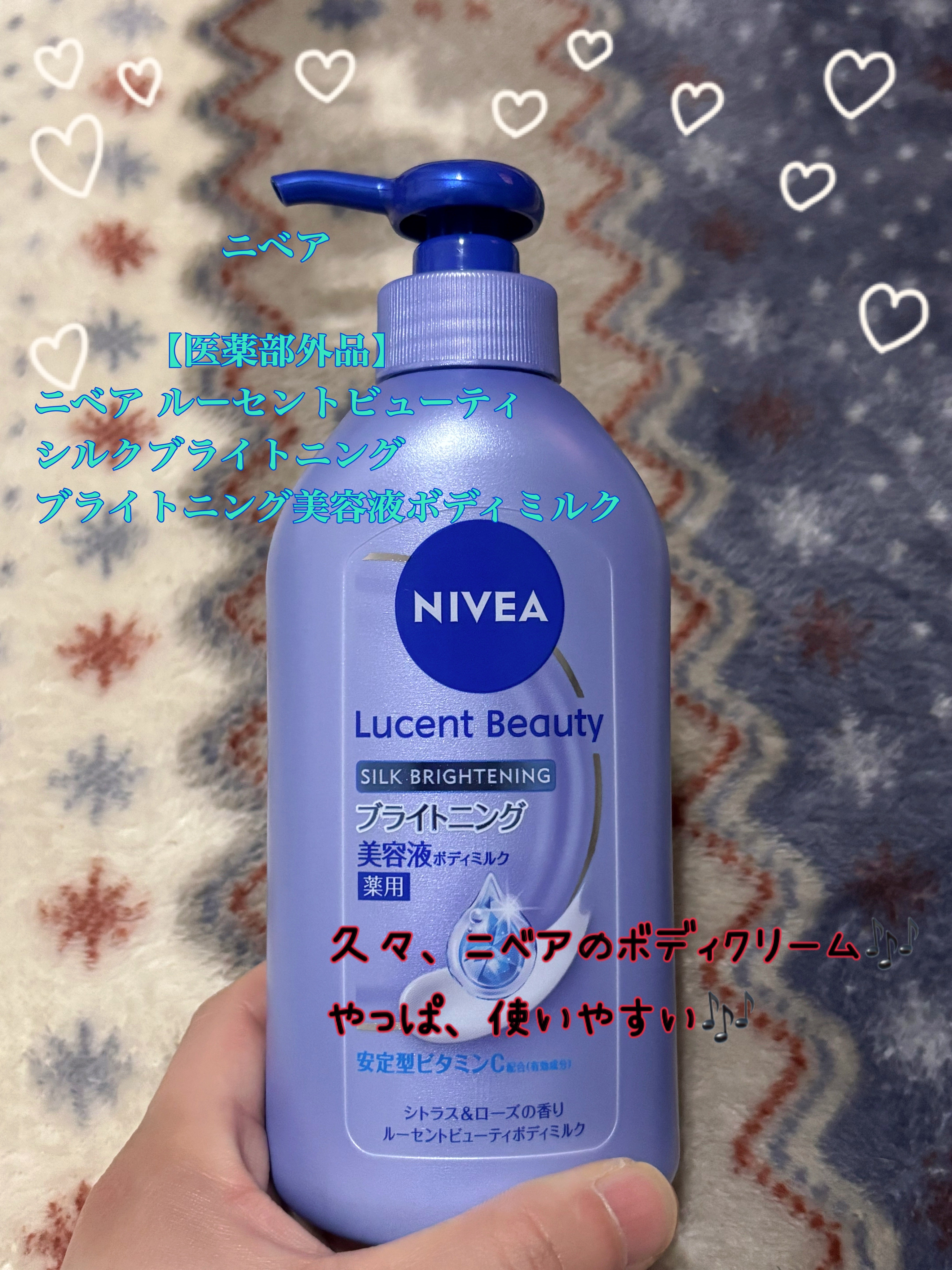 文字が見にくくなってしまったので、こちらにも同じ内容を書いておきます。商品→ニベア ルーセントビューティーシルクブライトニング美容液ボディミルク今回はリニューアル前からリピートしてるボディミルクをレビューしていきます。まずは結論!とろみのあるテクスチャでのびが良く、ベタつきにくいので毎日の保湿にぴったり!塗っておくと個人的には一日中乾燥を感じないいいなと思った所·のびが良くてベタつきにくいから全身を保湿するのにぴったり·ポンプタイプでだしやすい·ベタつきにくいので夏でも使いやすい·保湿力があるので一日中、乾燥を感じにくい·においが好みちょっと気になった所·においが強いので苦手な人は苦手かも(個人的にはミルクティーのにおいみたいに感じ)という感じです!個人的にはとにかくベタつきにくいので続けやすいです💕これからもリピートします✨という文章でした。私は乾燥しやすいので、毎日全身保湿しないと痒くてイライラしちゃいがちなのでこのニベアは欠かせません✨全部個人の感想なのでご参考までに!#寒い季節のボディケア