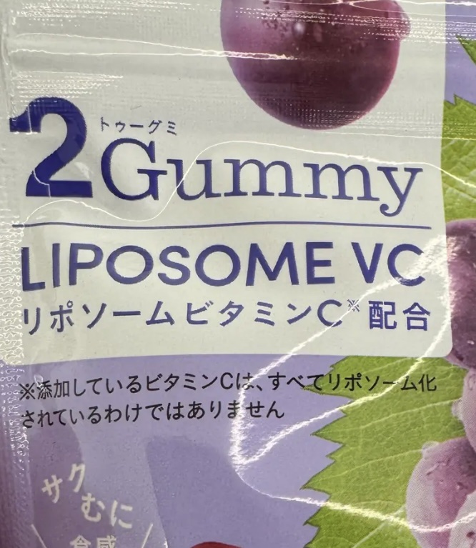 2GummyLIPOSOMEVC50g/¥486一袋にビタミンC1,000mg配合1日に一袋目安なのでコスパ面は△甜菜糖由来の優しい甘さのぶどう味後味にほんのり酸味を感じるむっちり食感の美容グミ普段グミは好んで食べない私だけどパッケージ文言の...