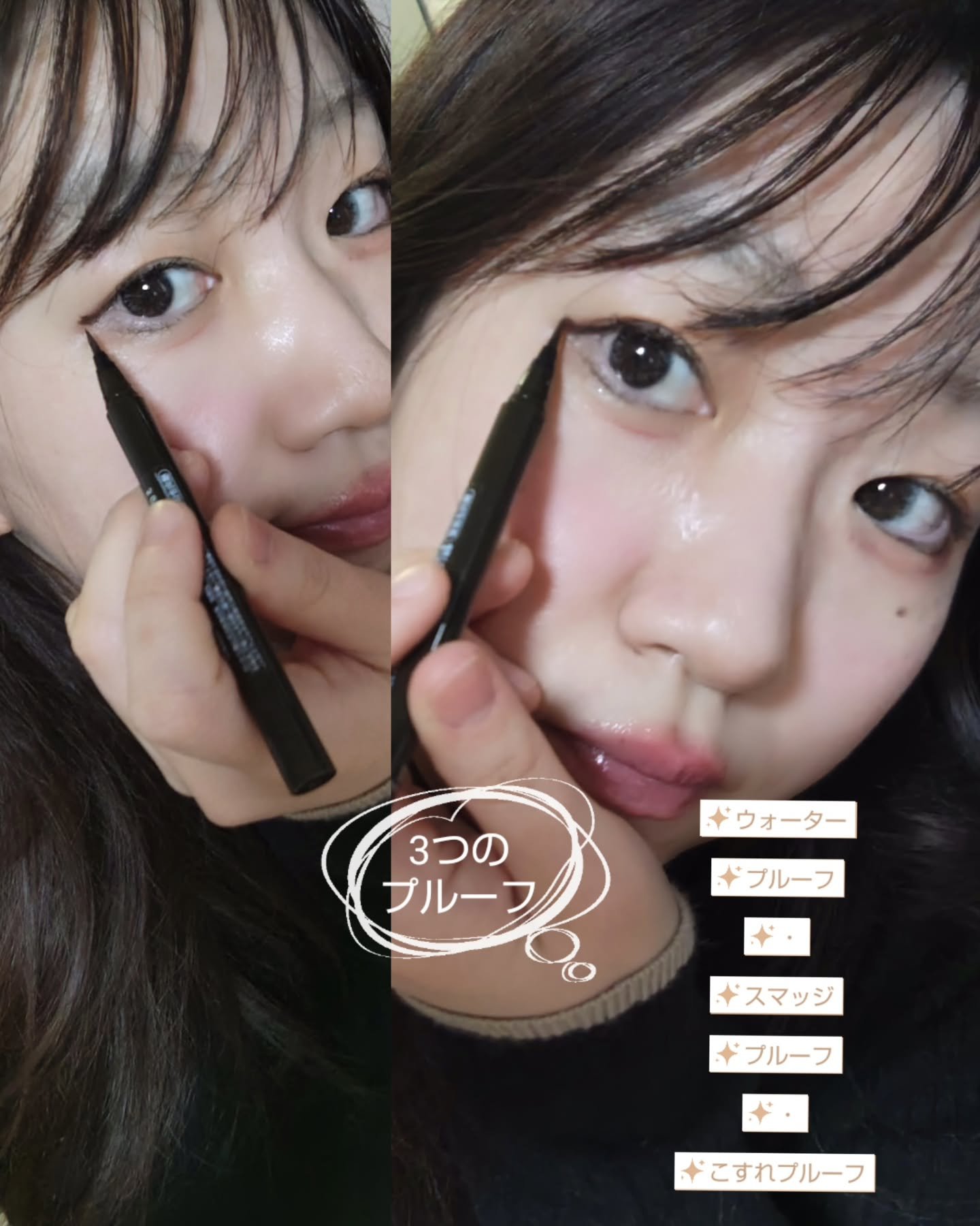 とにかく、めちゃくちゃ描きやすい!正直「最近のアイライナーはどれも描きやすいでしょ」って思ってたけど、これはレベル違った🫣!!筆先が安定してて、細いラインもブレずにスッと描ける。繊細な目尻ラインが本当に描きやすい。これは画像じゃ伝わらないから...