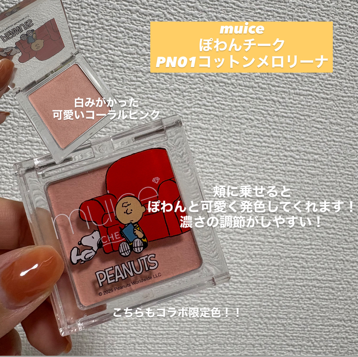 PEANUTSスヌーピーコラボコスメ✨今回はパケに一目惚れしたスヌーピーコラボコスメを紹介します!①tilnusサンリットパールティントS101グッドレッド定価1650円コラボ限定色の可愛いオレンジレッド。ティルナスも落ちにくいと話題になって気になっていたので、スヌーピーとコラボしたこの機会に購入しました✨サラッとしたテクスチャーで塗りやすく、落ちにくいと思います!そしてパケが可愛い笑スヌーピーとチャーリーブラウン、愛しいです🥰②muiceちゅるリッププランパーPN01モアチャイ定価990円ほんとにミュアイスは優秀なのに安い!プチプラ代表ですよね!こちらはプランパーで乾燥している時に使ったり、重ねつけしたりして使用してます。縦シワも気になる無くなりますが、重ね付けしたときにリップの相性によってはもろもろが出ることがある為少し気になります、、けどコラボ限定色でとても可愛いです🥰③muiceぽわんチークPN01コットンメロリーナ定価990円muiceのチークは初めて使用しました!テスターで色を確認した時、手の甲だと色がわかりづらく、頬にちゃんと色のるのかな?とすこし不安でしたが実際にのせてみるとぽわんと発色して可愛い!濃さも調整しやすく最近使いがちです!このパケ可愛すぎ!!ほんとに可愛いパケのコスメは心が満たされますね、、☺️8月に発売された商品ですが、お店によってはまだお取り扱いあるかも??最後まで見てくださってありがとうございます🙇♀️#韓国コスメ#tilnus#muice#ティント#チーク#プランパー#イエべ秋#イエベ#スヌーピー#スヌーピーコラボ#購入品紹介
