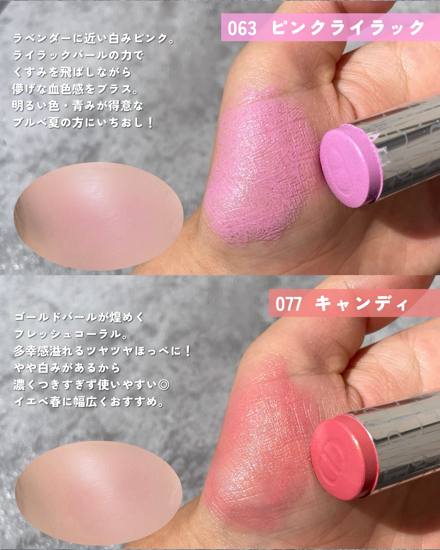 \天才チーク爆誕🎀/今季話題を独占している、ディオールバックステージ💄4色のハイライトパレットが大人気だけど、新作スティックチークこと“ロージーグロウスティック”もとんでもない可愛さ♡可愛すぎるビジュにやられて、取り急ぎ全色ポチったんだけどこれが大正解でした◎クリーミーなテクスチャーでスルスル塗れちゃう♪ベタ塗りするとがっつり発色するんだけど、指でトントン馴染ませるとうるうるの美しい濡れツヤが爆誕💎スティックならではのじゅわっとした血色感で、これが天才的に可愛いの🤍肌のpHレベルに反応して発色が変化するから、自分だけのカラーを楽しめちゃう✨色持ちも良いし、ベタベタしないしかなり使いやすい◎結構発色が良いので、私は指に取って少しずつトントンと馴染ませてるよ。器用なな方は頬に直塗り→馴染ませるでももちろんOK🙆♀️カラバリは全6色♡今回全色スウォッチしてみたよ♪063ピンクライラック透明感あふれる輝きを実現するライラック001ピンクアイコニックなピンク012ローズウッドエレガントに表情を演出するローズピンク015チェリーひと塗りで表情を華やかに彩る鮮やかなチェリー🍒077キャンディゴールドの繊細なパールが輝くピーチピンク103トフィー柔らかな血色感を叶えるヌードベージュブルベ夏の私は063、001、012の3色が特にお気に入り◎リップよりも大きめのサイズ感で持ち歩きにも便利なので、是非チェックしてみて❣️・・⋈・-・・—・⋈・-・・—・⋈・-・・—・⋈・-・・—・⋈・・DIORバックステージロージーグロウスティック全6色・¥7,040(税込)8/1全国発売公式オンライン等で先行発売中・・⋈・-・・—・⋈・-・・—・⋈・-・・—・⋈・-・・—・⋈・・@diorbeauty@diorbeautylovers#DIOR#Diormakeup#チーク#Diorbackstage#ディオール
