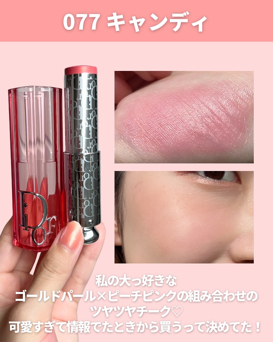 気に入りすぎて追加購入したDiorバックステージロージーグロウスティック💓追加はパウダーの方を買っていた077キャンディ🍬コーラル系のカラーにゴールドラメ可愛すぎん??🥰スウォッチ上077キャンディ下012ローズウッド(青みピンク🩷)
