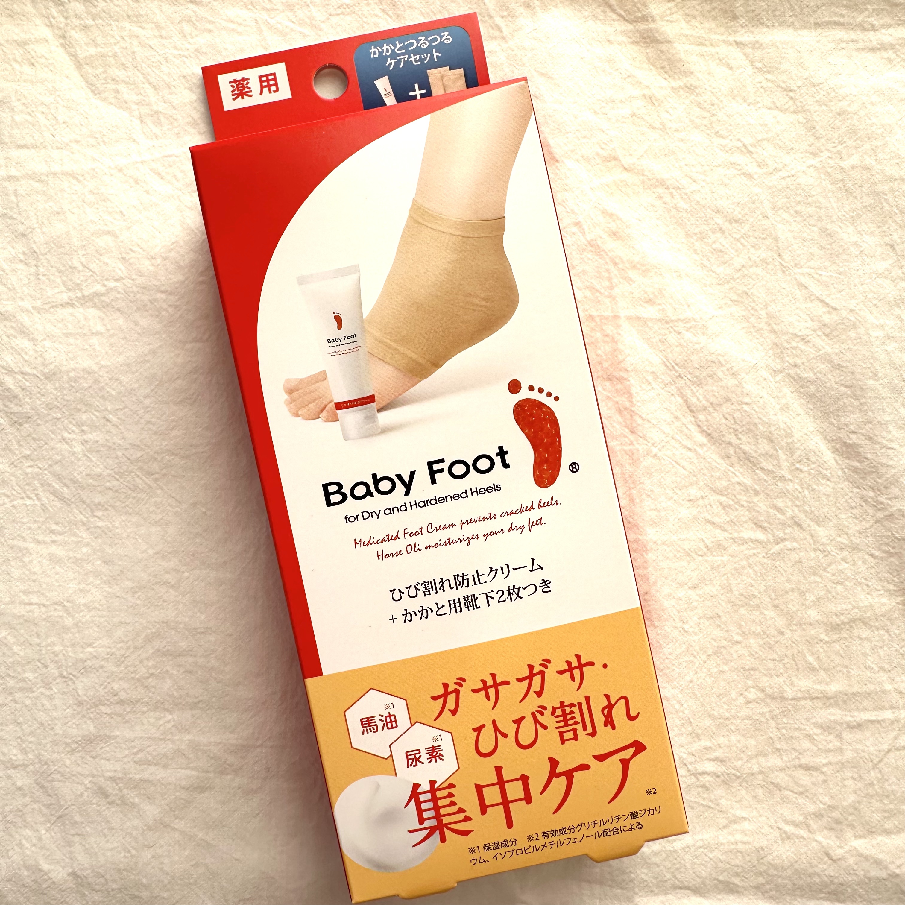 - 【医薬部外品】 かかとのひび割れを防ぐスペシャルケアセット。 医薬部外品のひび割れ防止クリームとかかと用靴下がセットになっており、クリームには保湿成分として尿素・馬油も配合されています。 <クロミとコラボレーションした「ベビーフット かかとひび割れ予防セット クロミ パッケージ」を2025年9月18日(木)から、全国のバラエティショップ・リベルタ公式オンラインショップ・ECモールにて数量限定発売>