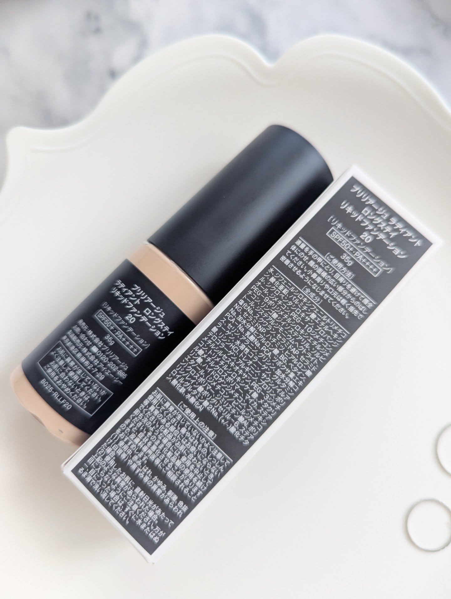 ブリリアージュラディアントロングステイリキッドファンデーションを使いました。SPF50+、PA++++。カラーは20(カラーは3種類あるみたいですね)紫外線吸収剤不使⽤のノンケミカル処⽅で、しっとりなめらかな肌仕上がりが⻑時間続くんだそうです...